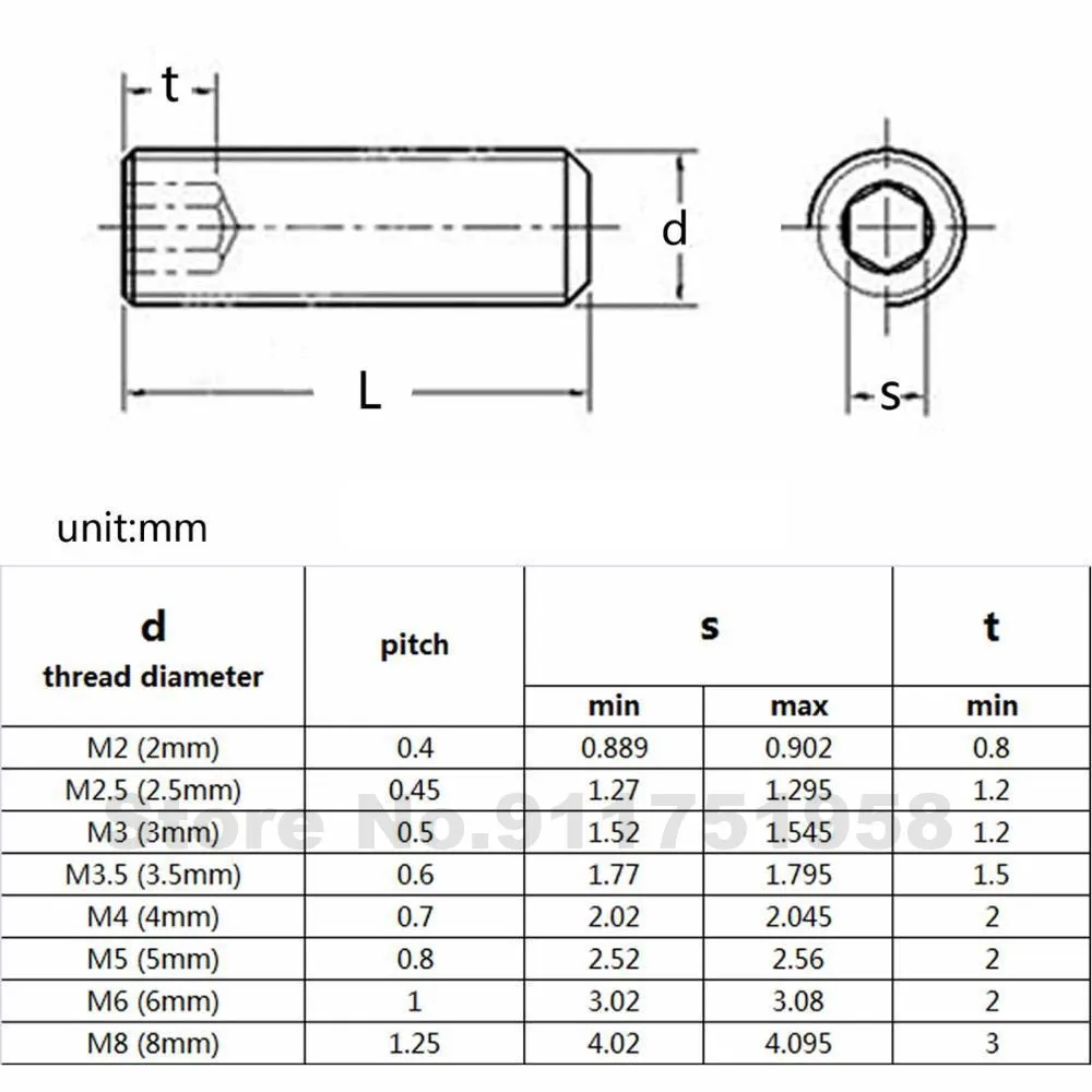 0,5 мм (M3)/0,7 мм (M4)/0,8 мм (M5)/1 мм (M6) /1,25 мм (M8)