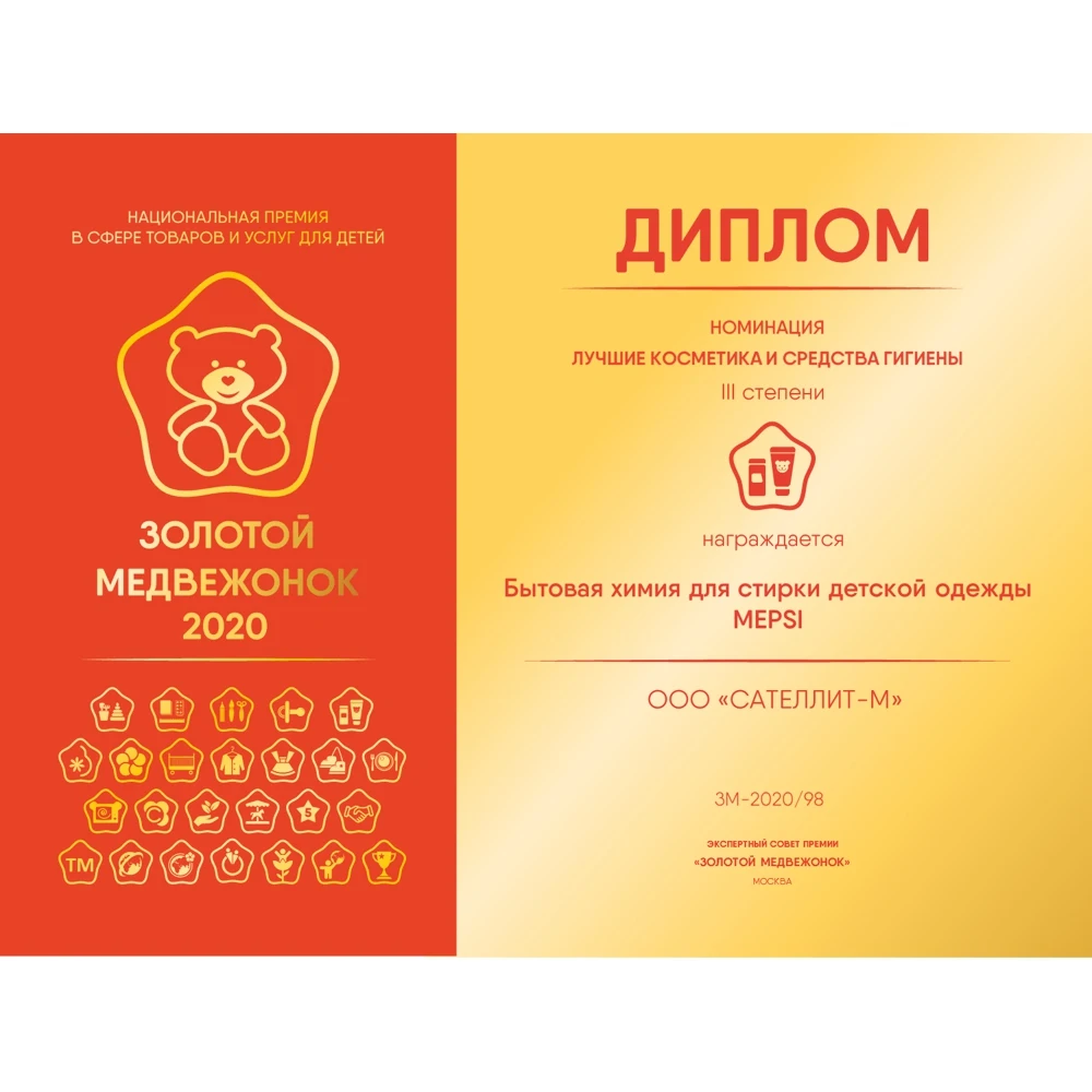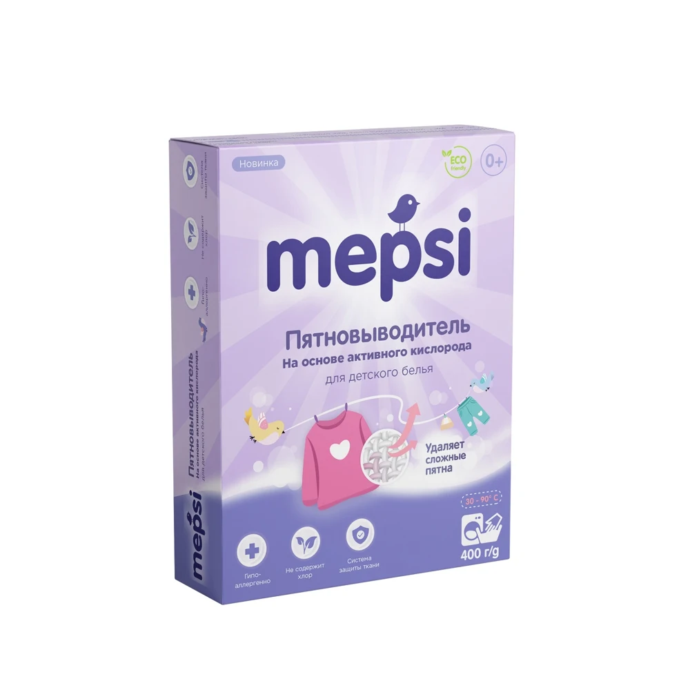 Подходит для выведения пятен различного происхождения (фруктов, чая, травы, шоколада, масла и специфических загрязнений) детского белья с первых дней жизни.