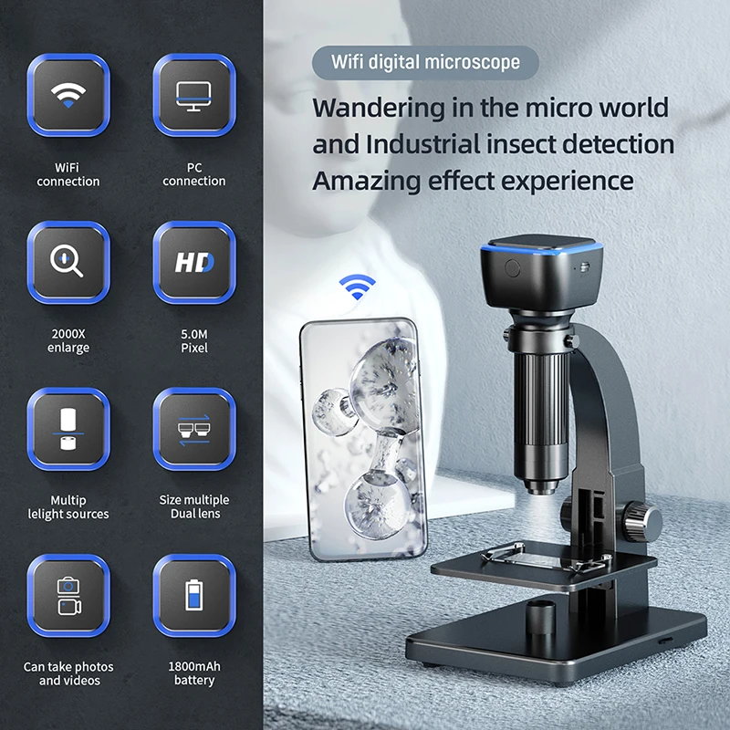 Двойной объектив Wifi цифровой микроскоп 50-2000XСотовыйМикроскоп 5MP микроскоп камера видео для наблюдения за наукой монета PCB растений