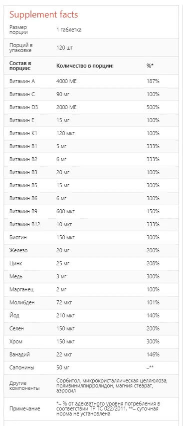Преимущества:9 основных минералов, 13 основных витаминов, цинк 25 мг + D3 2000 me.