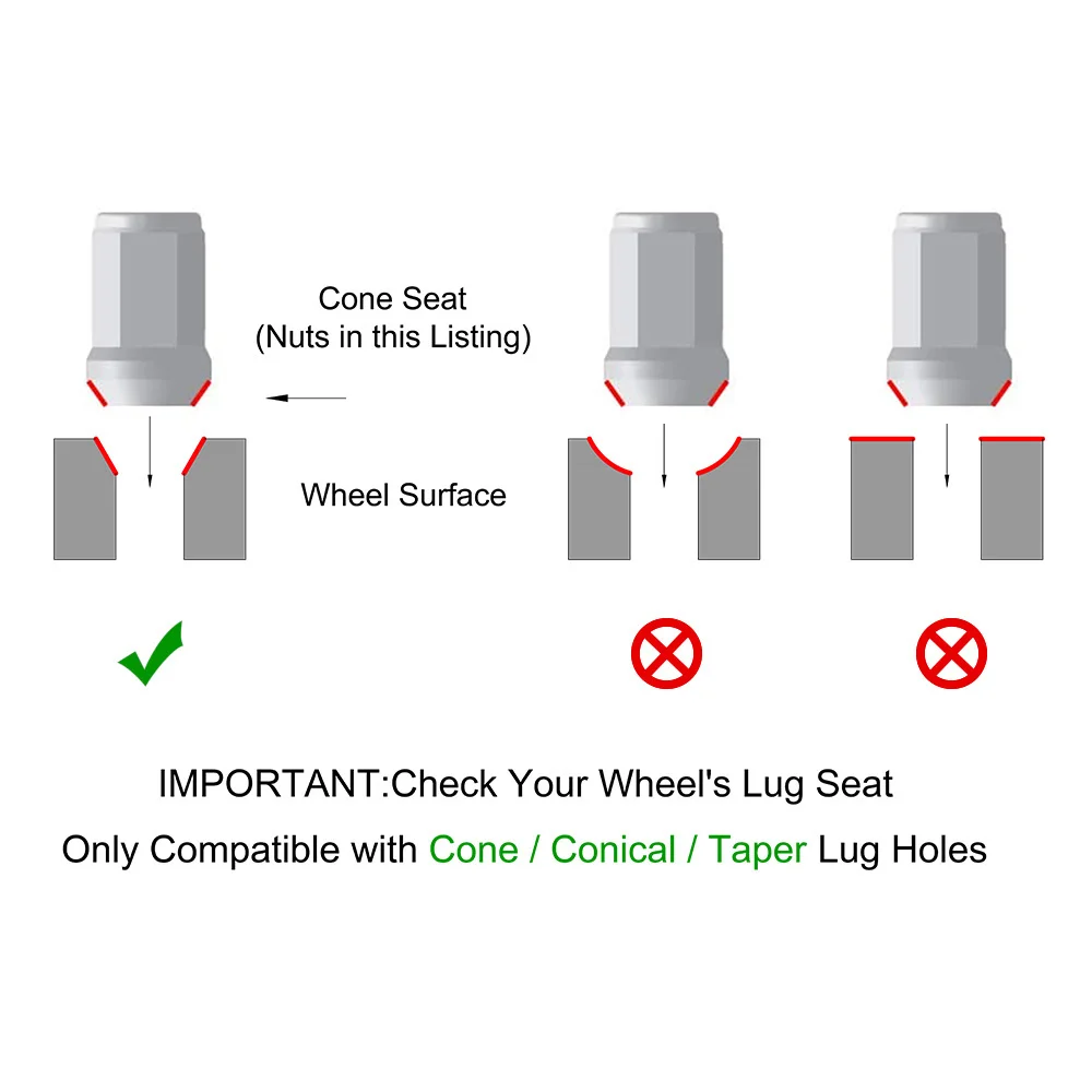 Подходит для большинства транспортных средств с M12 * 1,5 M12 * 1,25 шипами колес и колесами, которые используют стандартный размер 60 градусов коническая s-eat гайка.