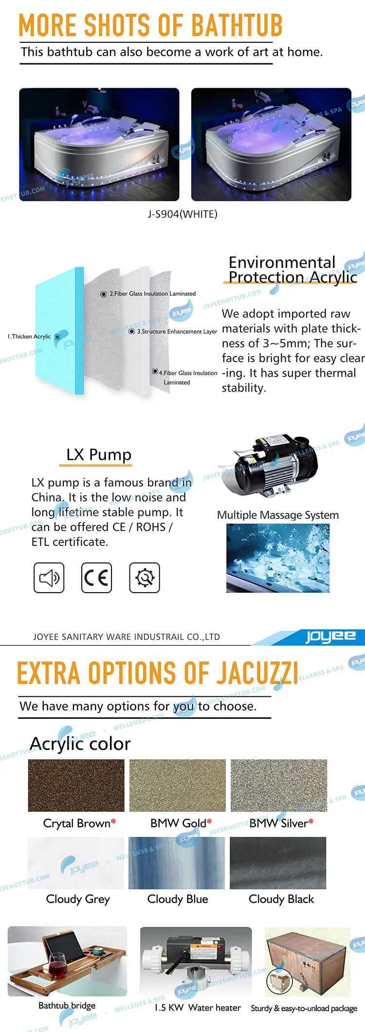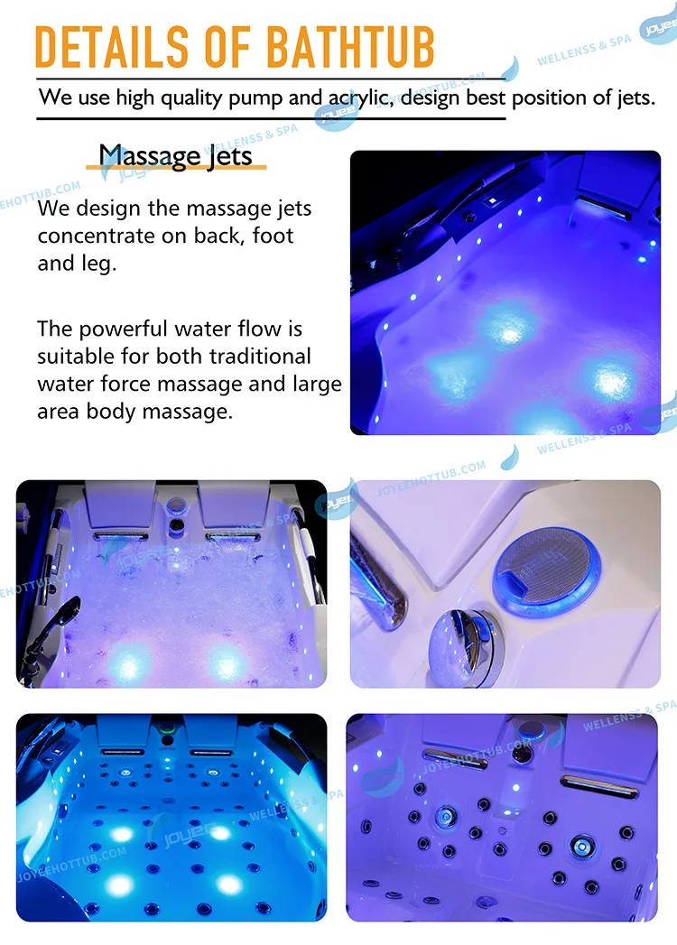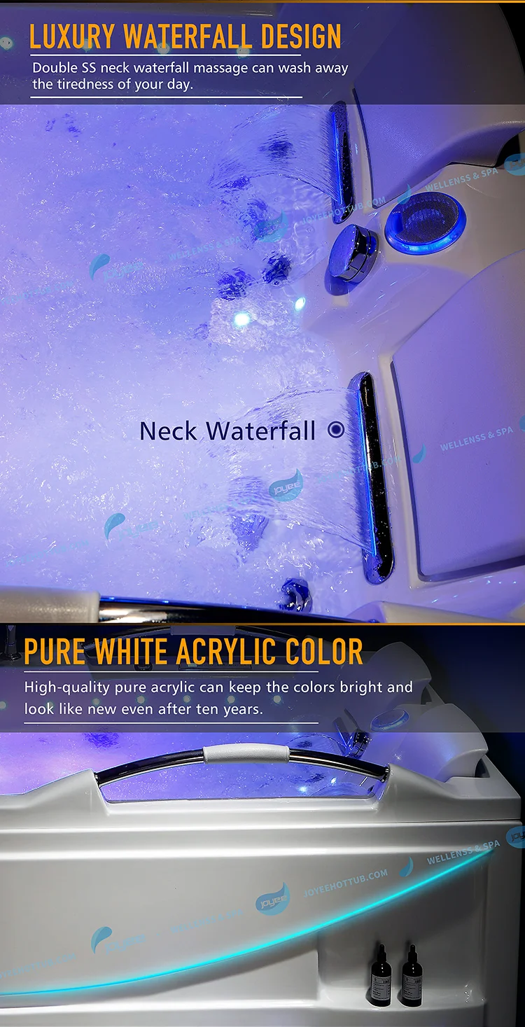 Наша Ванна изготовлена из 4 мм чистого акрила, рамы из нержавеющей стали и выбрать «LX» насос, который с сертификатом CE, UL и SAA. Каждая ванна должна пройти проверку воды 24 часа без протекания. Затем посылка.