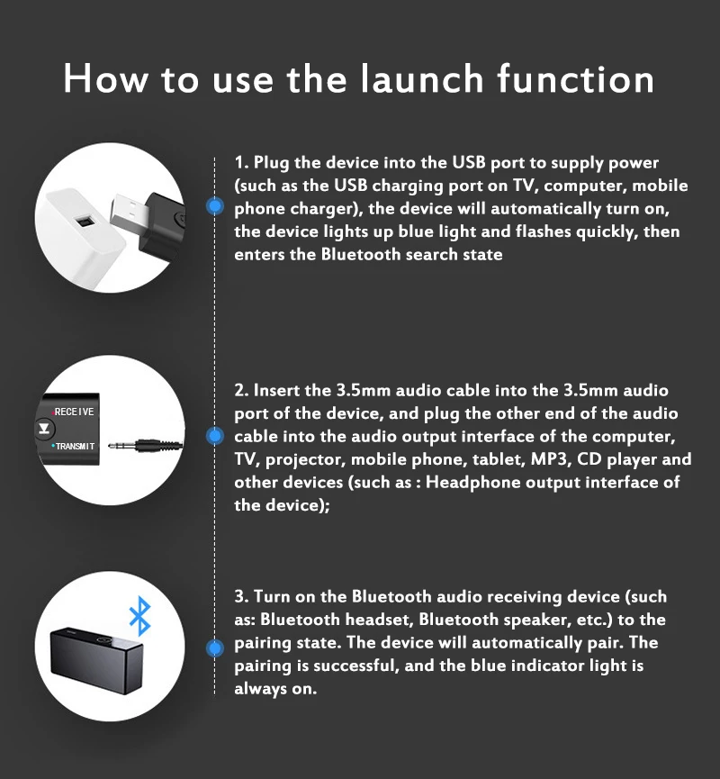 2. Подключите этот bluetooth-аудиоприемник к линейному или вспомогательному входу ваших динамиков, подключите его к bluetooth-устройству и наслаждайтесь революцией беспроводной музыки.