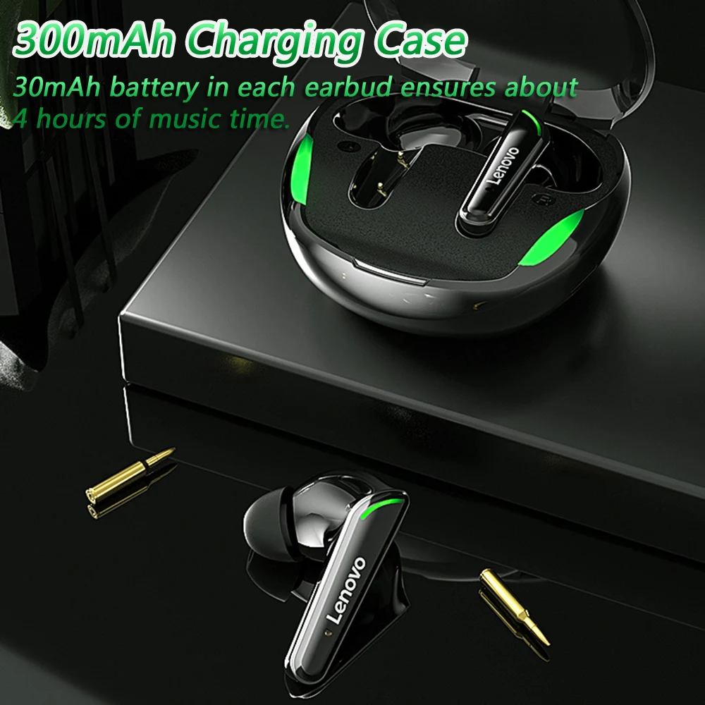 A 300mAh charging case can charge and store the earbuds. 30mAh battery in each earbud ensures about 4 hours of music time.