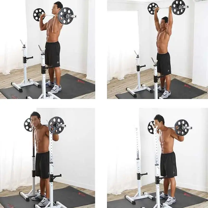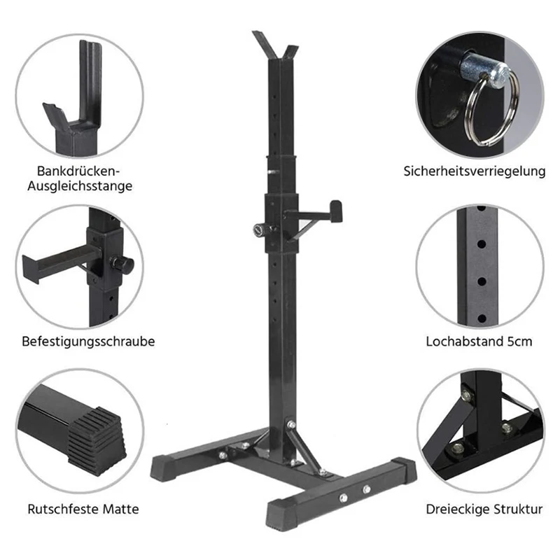 Размер упаковки: 96,5*31,5*12 см, вес брутто: 12,5 кг Материал: сталь, Максимальная нагрузка: 150 кг, длина * ширина дна одного Тяжелая атлетика Рама: 42*47 см, регулируемая высота 105-160 см, в верхней части стойки 15 отверстий, а в нижней части 6 отверстий (Гантель бара не входит в комплект). Характеристики продукта: 1. 100% абсолютно новый и высококачественный, прочный и долговечный, подходит для использования дома и в тренажерном зале 2. Это сверхпрочная стандартная стальная стойка для приседания, которая может использоваться для размещения штанги, выполнения различных упражнений, таких как тяжелая атлетика и приседания, а также использования отжиманий и упражнений на плечах. 3. Идеальная компрессионная прижимная стойка для нажатия вниз и лежа. Нажмите или удерживайте 4. Резиновые концевые крышки могут защитить пол от царапин 5. Стабильный и регулируемый по высоте, простой в использовании, профессиональное фитнес-оборудование 6. Легко регулируется, адаптируется к различным размерам гантелей, высота регулируется от 105 до 160 см 7. Стальная рама, прочная и долговечная; Квадратная стальная труба, более стабильная и безопасная, экономия места, простота установки и переноски Примечания:☀Можно использовать в любом положении: легко перемещаться на приседание, компактно, легко хранить и не занимать слишком много места в любом месте☀Подходит для вашего домашнего тренажерного зала, гаражного зала и даже маленького балкона в вашей квартире!☀Быстро Начните обучение в путешествиях, процесс сборки очень прост, не сдавливайте ноги каждого кронштейна до конца, пожалуйста, расслабьтесь и сложите остальное вместе