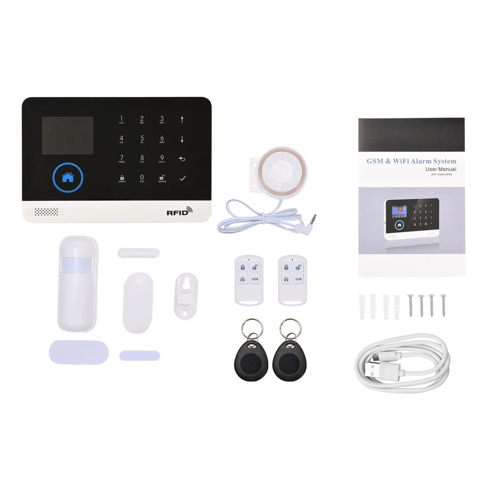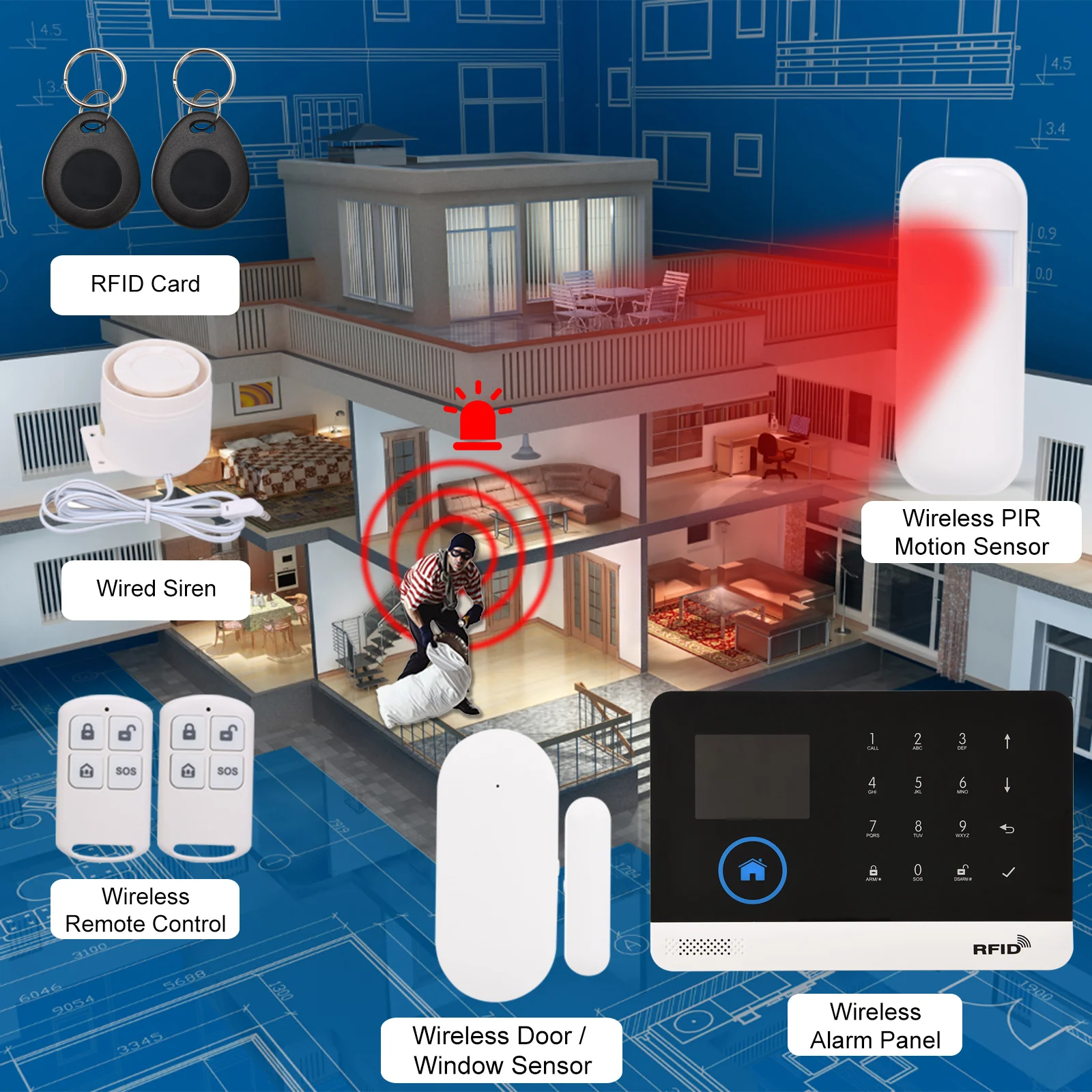 Эта система сигнализации содержит панель сигнализации WIFI + GSM, датчик PIR, датчик двери, проводную сирена, две RFID карты и два пульта дистанционного управления. Он поддерживает Голосовое управление Amazon Alexa/Google Home и дистанционное управление с помощью приложения для телефона. Вы можете использовать эту систему сигнализации через хост, телефон или пульт дистанционного управления. Расширенные функции домашней автоматизации для идеальной умной домашней жизни. Когда вор войдет, сигнал тревоги отправит 110 дБ предупреждения, чтобы отпугнуть вора, или он сделает автоматический циферблат или отправит сообщение, чтобы напомнить вам, таким образом, это поможет вам уменьшить потери собственности и гарантировать безопасность вашего дома.