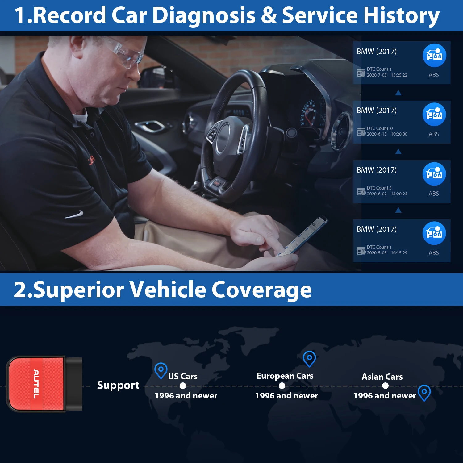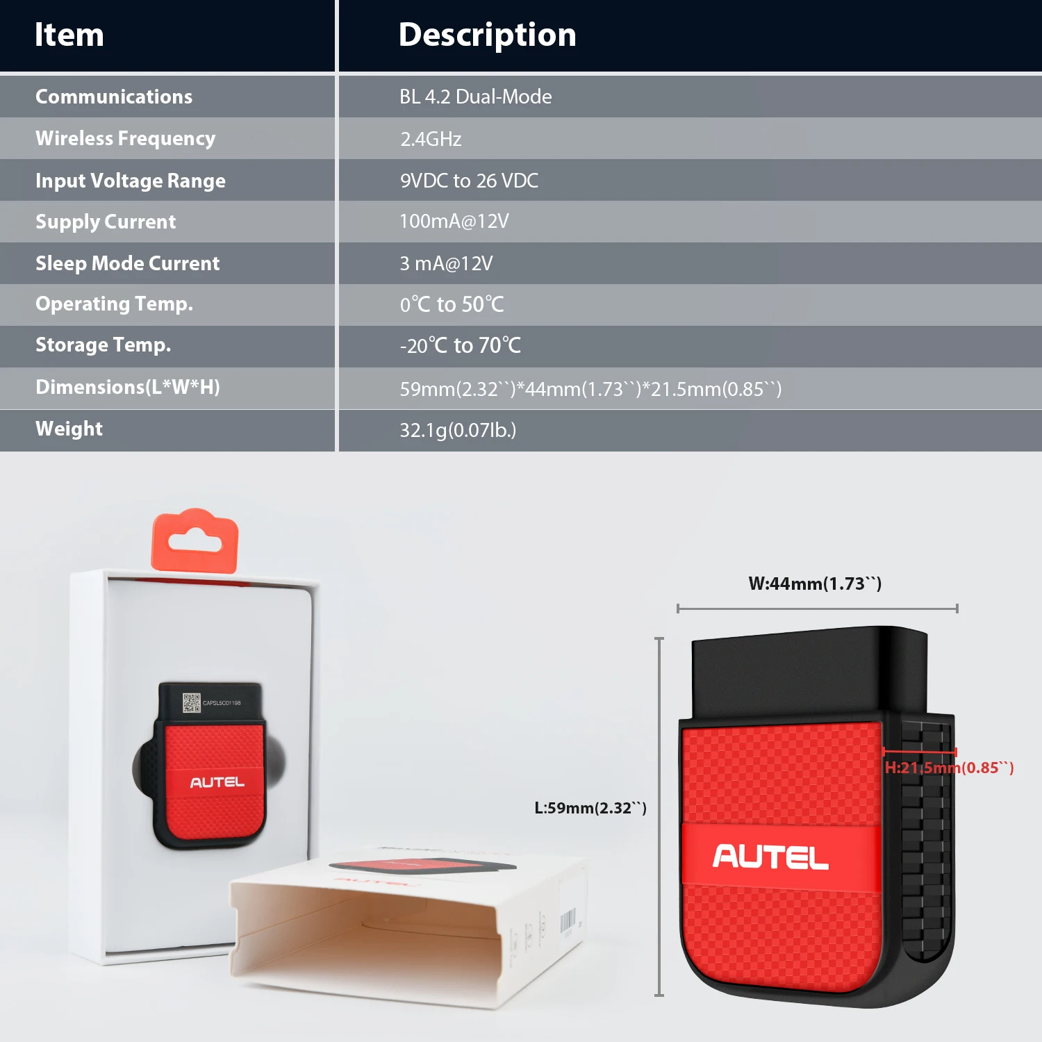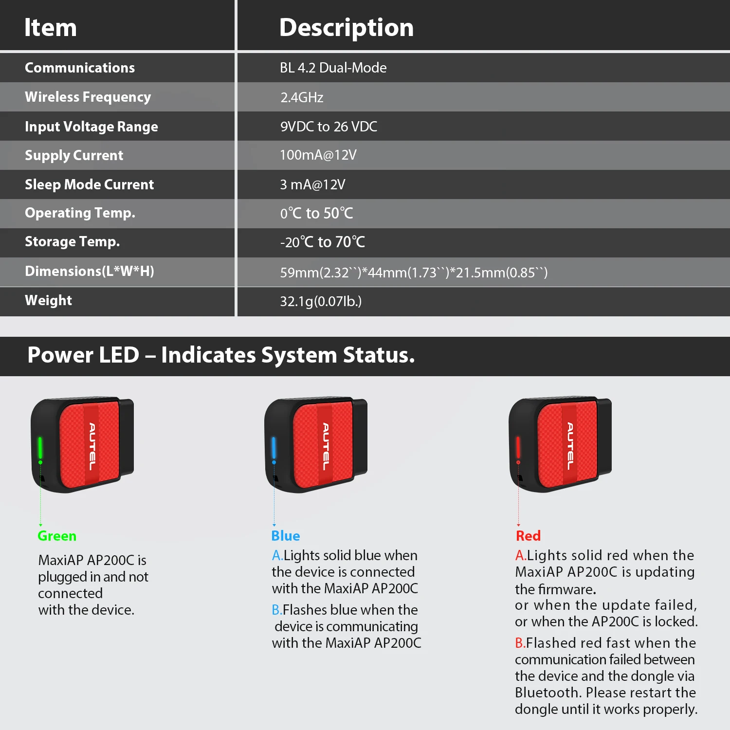В комплект MaxiAP AP200C входит ключ Bluetooth (BT) и приложение maxiap200. Он используется для подключения к порту OBDII автомобиля и подключения к устройству Android или iOS для быстрого и простого обслуживания. Он почти совместим со всеми моделями Автомобилей европейских, азиатских и американских автомобилей 1996 года и новее.
