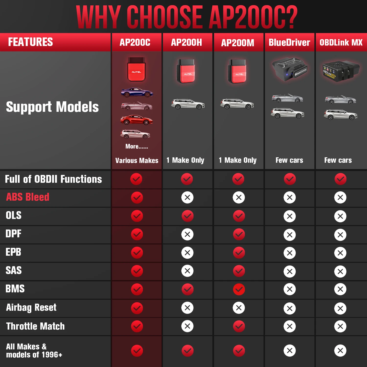 MaxiAP AP200C-это считыватель кодов и сервисный инструмент для легкого выполнения 8 наиболее распространенных сервисных услуг, включая сброс масла, EPB, BMS, DPF, SAS, соответствие дроссельной заслонки, сброс ABS и подушки безопасности для всех марок и моделей автомобилей.