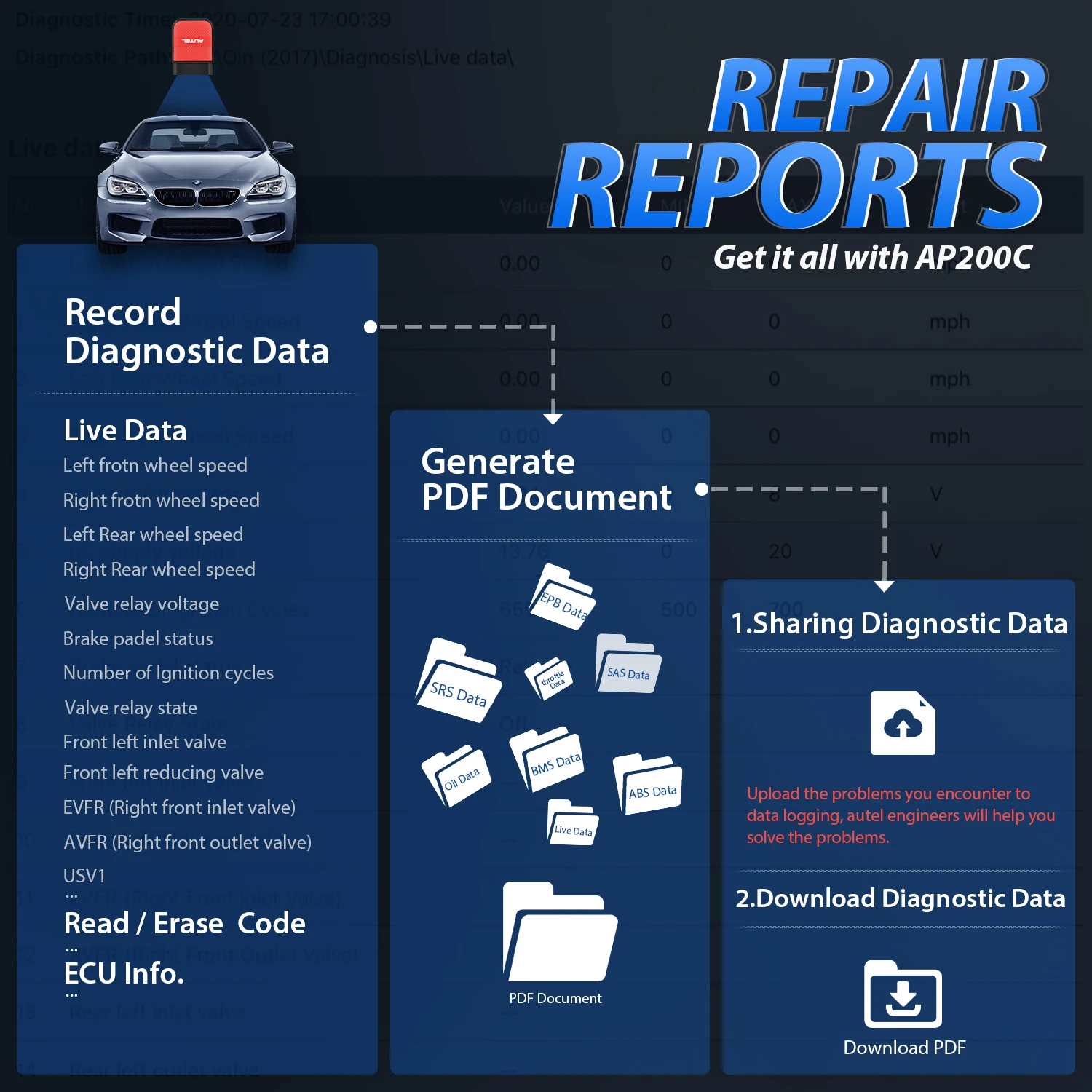 Приложение MaxiAP AP200C может сохранять отчет о ремонте для сеансов диагностики и обслуживания EOBD. PDF также может быть создан для удобного просмотра, обмена и печати.