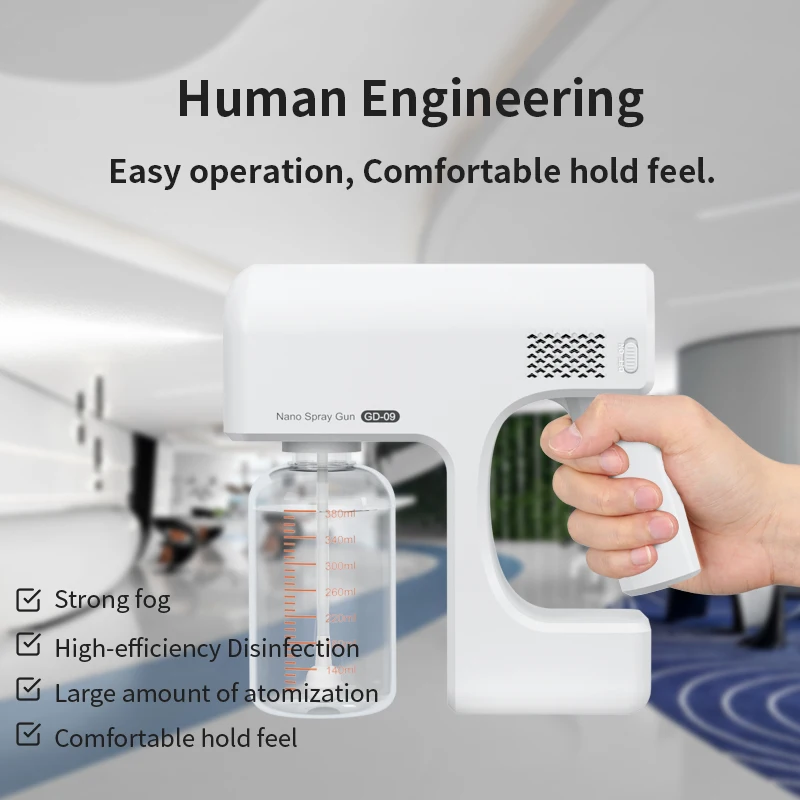 1.GD-09-это нано-распылитель. Основной принцип заключается в том, чтобы управлять двигателем в соответствии с батареей 12V18650. Двигатель приводит воздушный насос для производства давления воздуха для создания отрицательного давления. При отрицательном давлении жидкость всасывается в сопло и распыляет равномерные и мелкие частицы водяного тумана.
