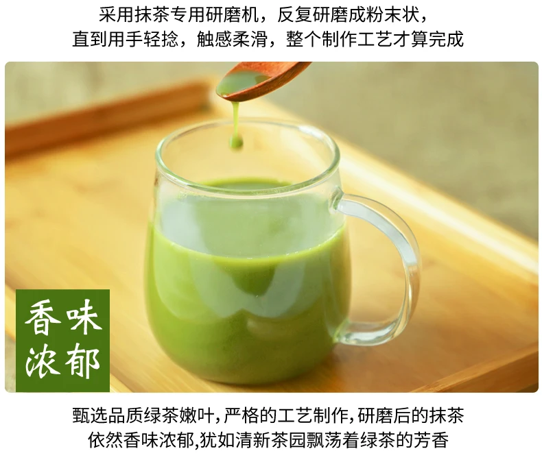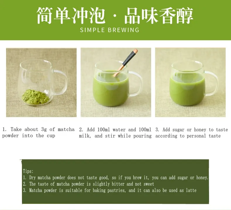 Матча подходит для применения чайных напитков (Е. g. Холодный Чай, чистый чай, фруктовый чай, молочный чай) в качестве основного сырья или в качестве пищевой добавки для торта, конфет и шоколада и т. Д.