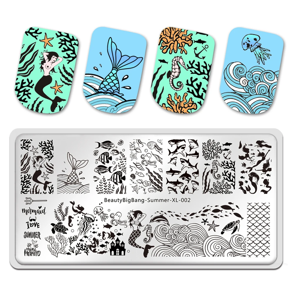 Beautybigbang штампованные пластины для ногтей Летняя XL-002 Русалка волна акула море изображение 6*12 см из нержавеющей стали штамп шаблон для дизайна ногтей