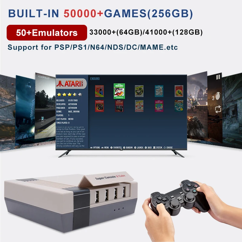 Поддержка 50 + эмуляторов, 64G предустановленных 33000 + игр, 128G предустановленных 41000 + игр, 256G предустановленных 50000 + игр, поддержка добавления игр самостоятельно.