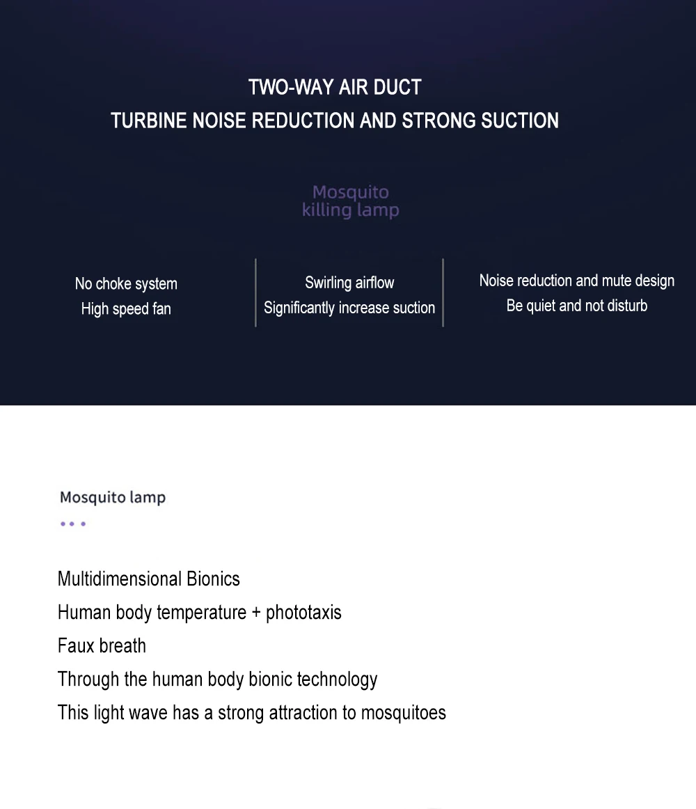 1. УФ-лампа и вентилятор всасывания: принят физический принцип, специальный светодиодный Ультрафиолетовый притягивает москитов, и это устройство закрывает москитов внутри до смерти.