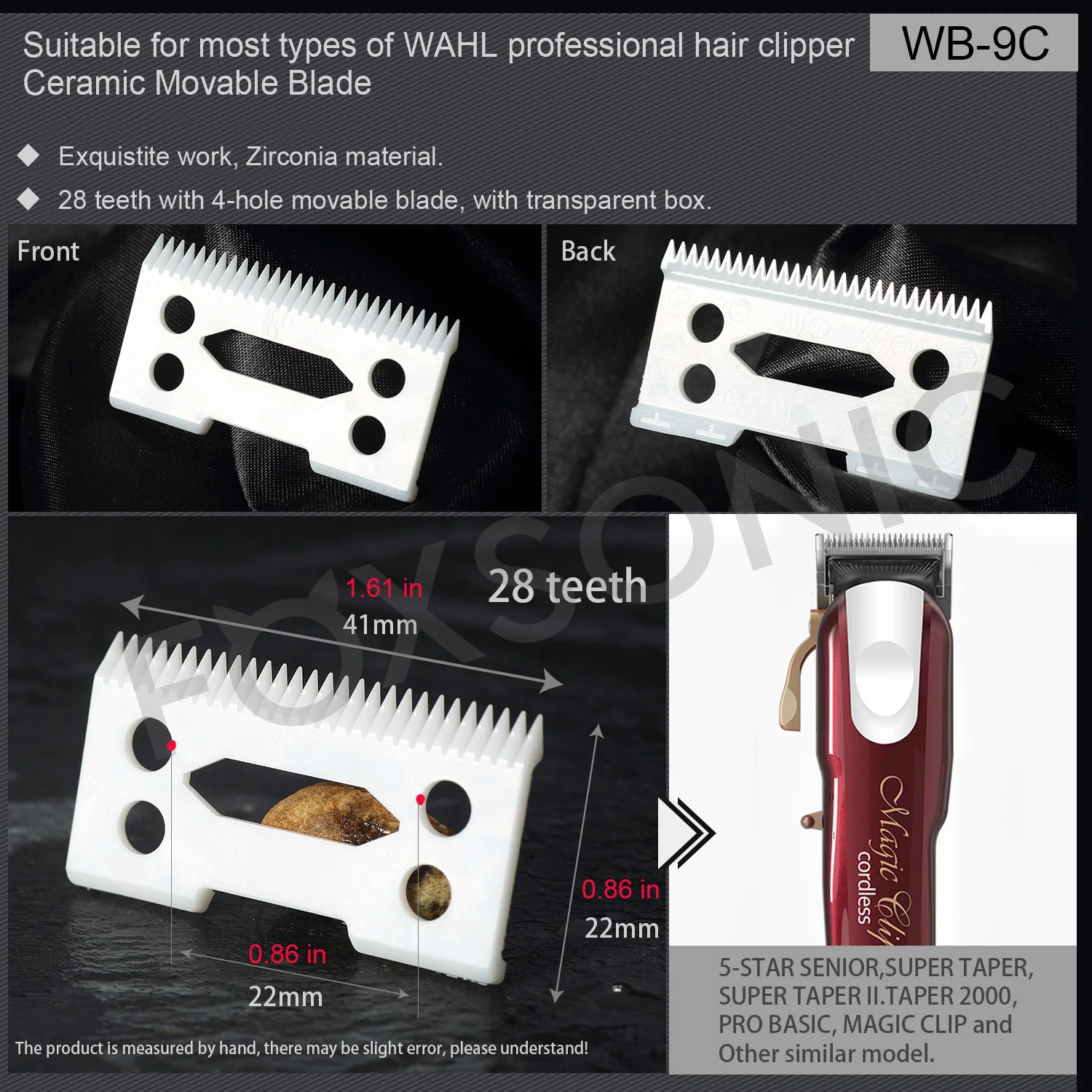 Подходящая модель: подходит для всех проводных и беспроводных клипсов Wahl, включая: WAHL Professional: Super Taper, Super Taper II. Icon, Pro Basic и Taper 2000;WAHL 5-Star: 5 Star Senior,Magic Clip;WAHL Sterling3, STERLING 9. Reflections Senior.