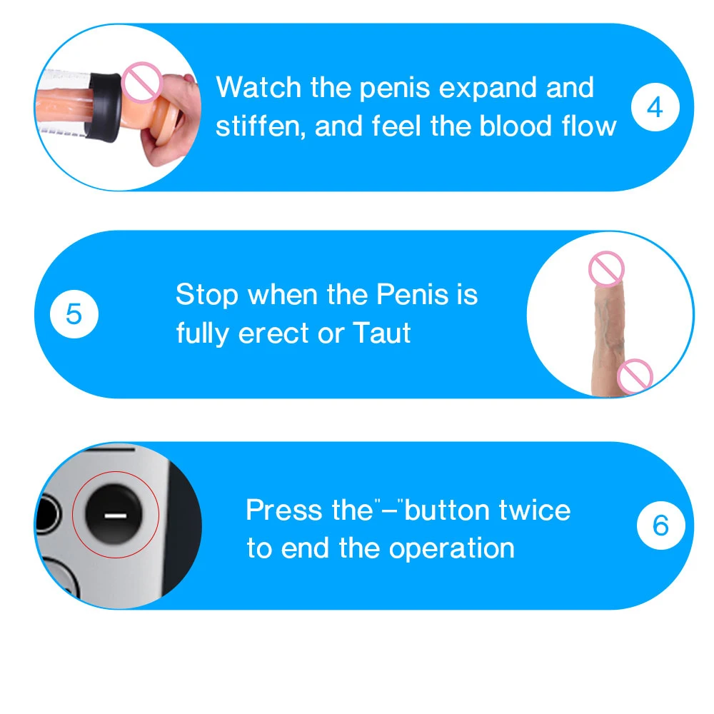 Продолжайте накачивать/выпускать воздух до тех пор, пока не найдете подходящий для вас уровень вакуума: Пенис должен выглядеть опухшим, но не должен болеть.