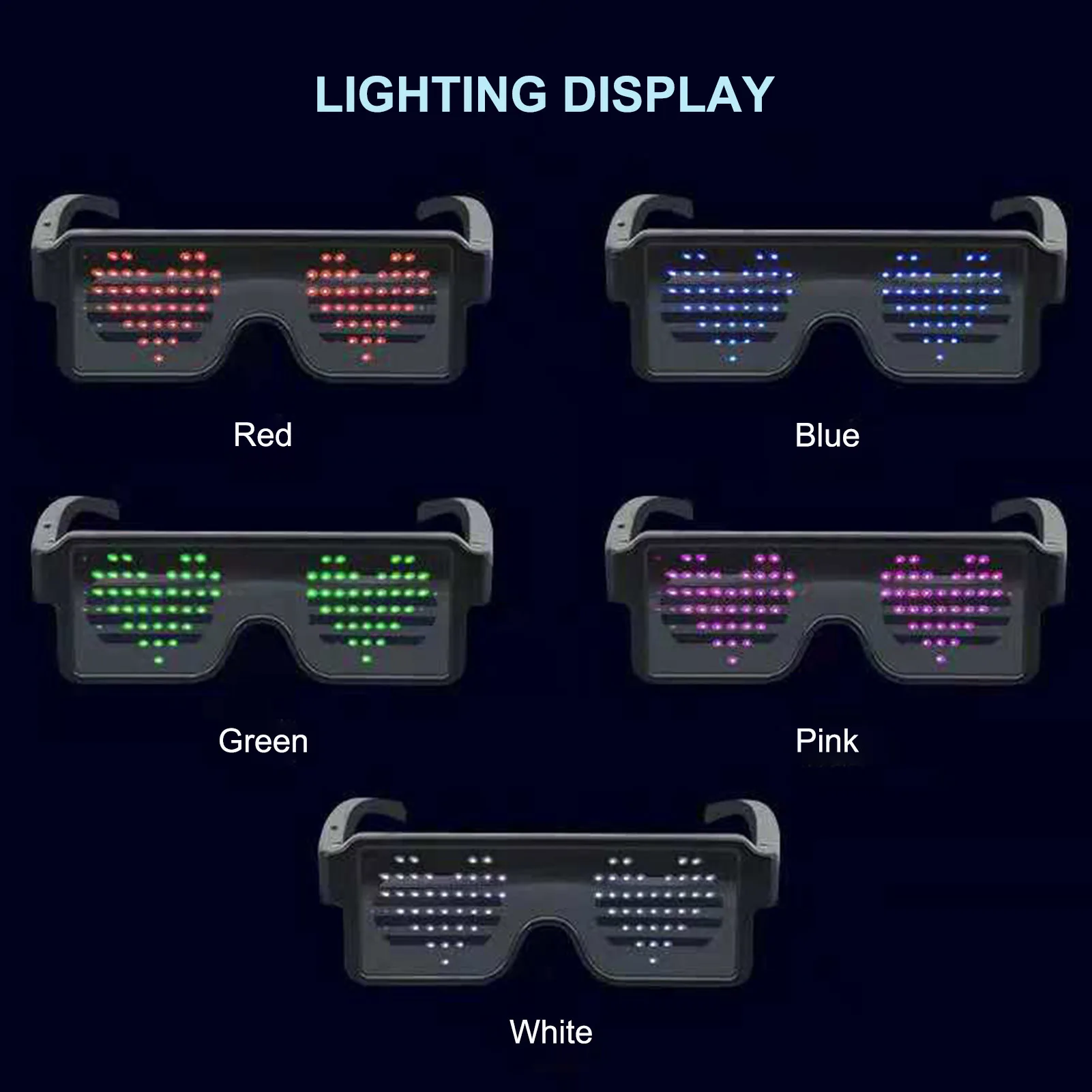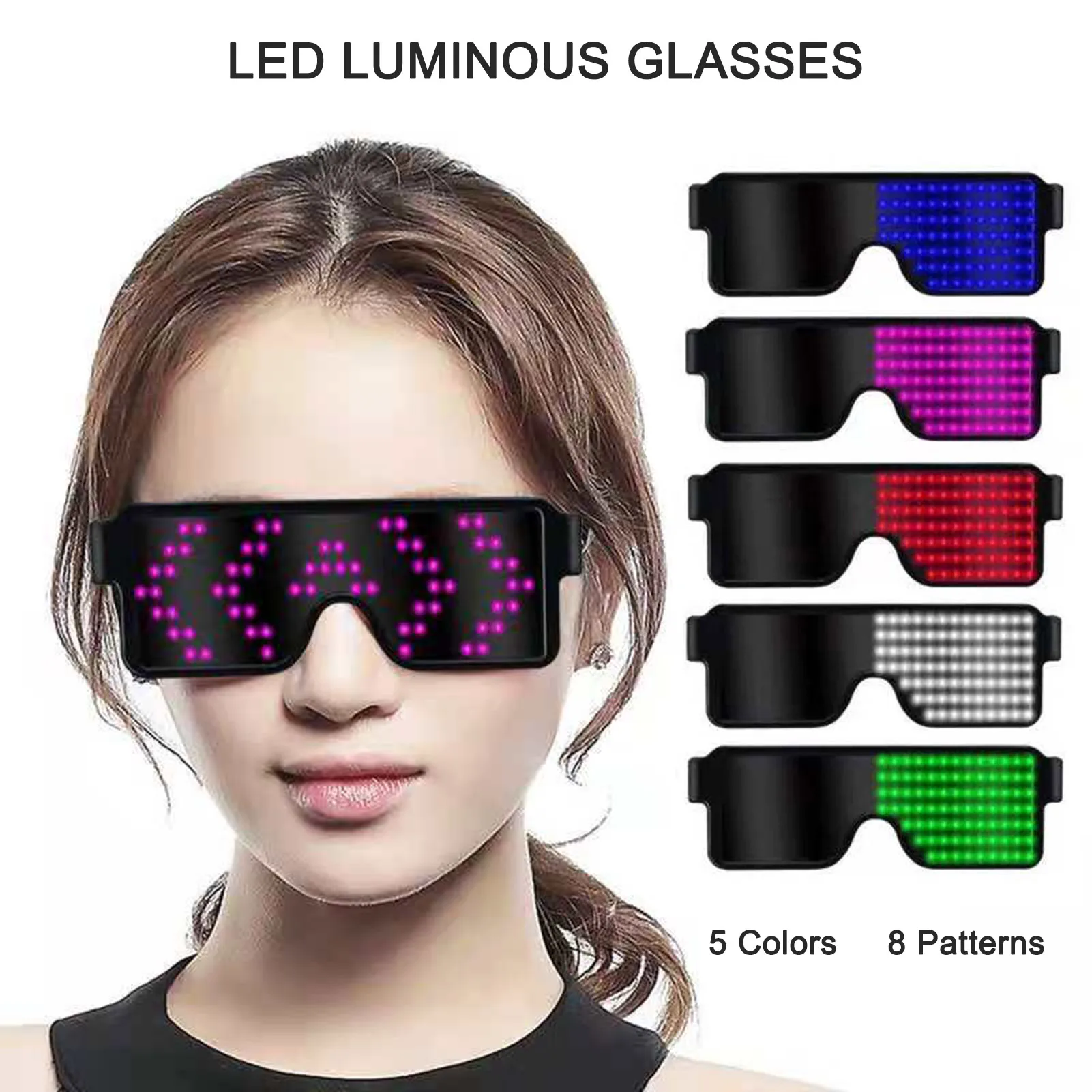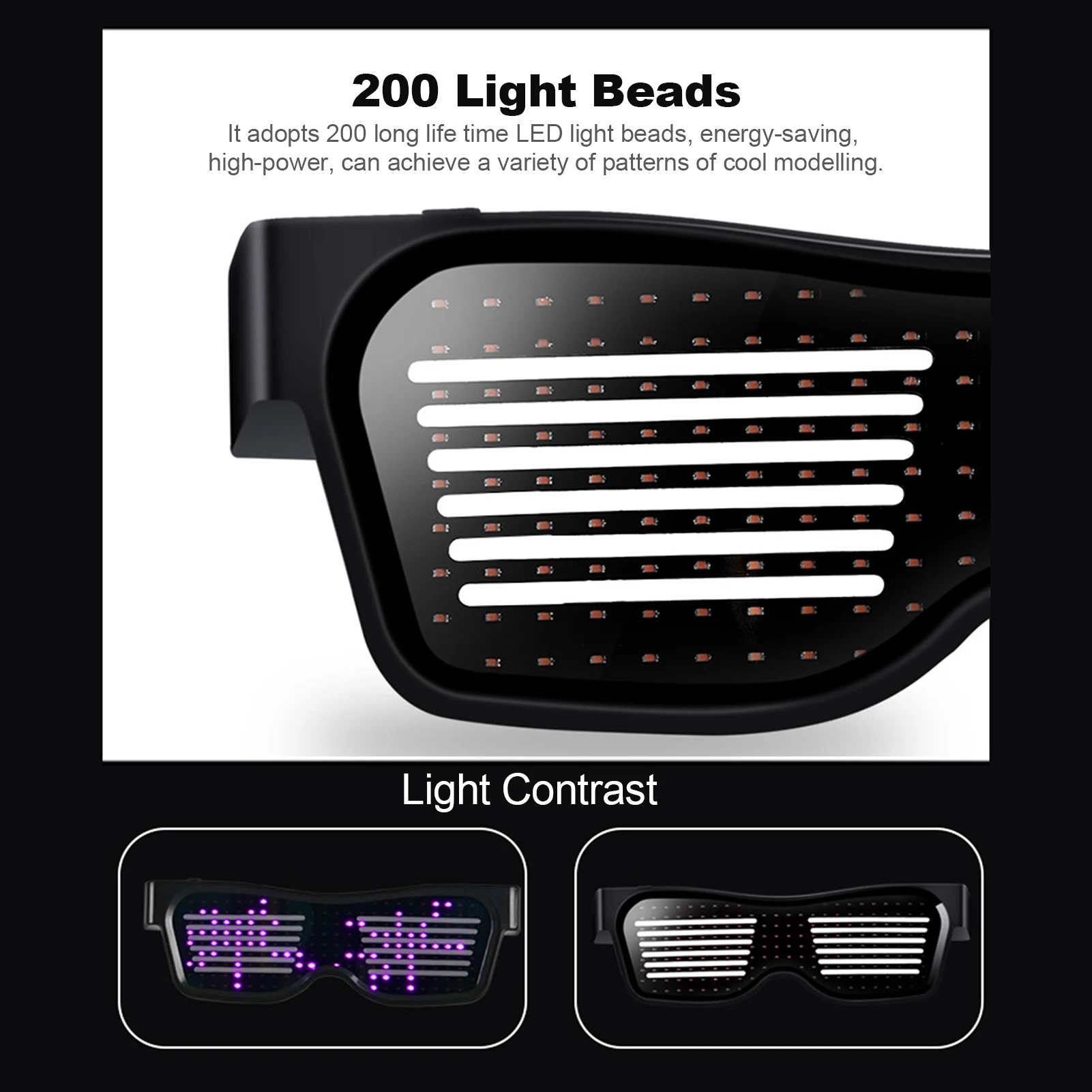 Простота в эксплуатации, 8 моделей:Длительное нажатие может начинаться и закрываться, а короткое нажатие может переключаться на узоры. Двойной щелчок позволяет петлить анимационный узор и удерживать кнопку вниз, чтобы выключить очки.Есть 8 видов узоров, включая мигание, скелет, поцелуй, сердцебиение, доллар, стрелу, сердцебиение и фейерверк. Вы можете выбрать тот, который вам нравится.