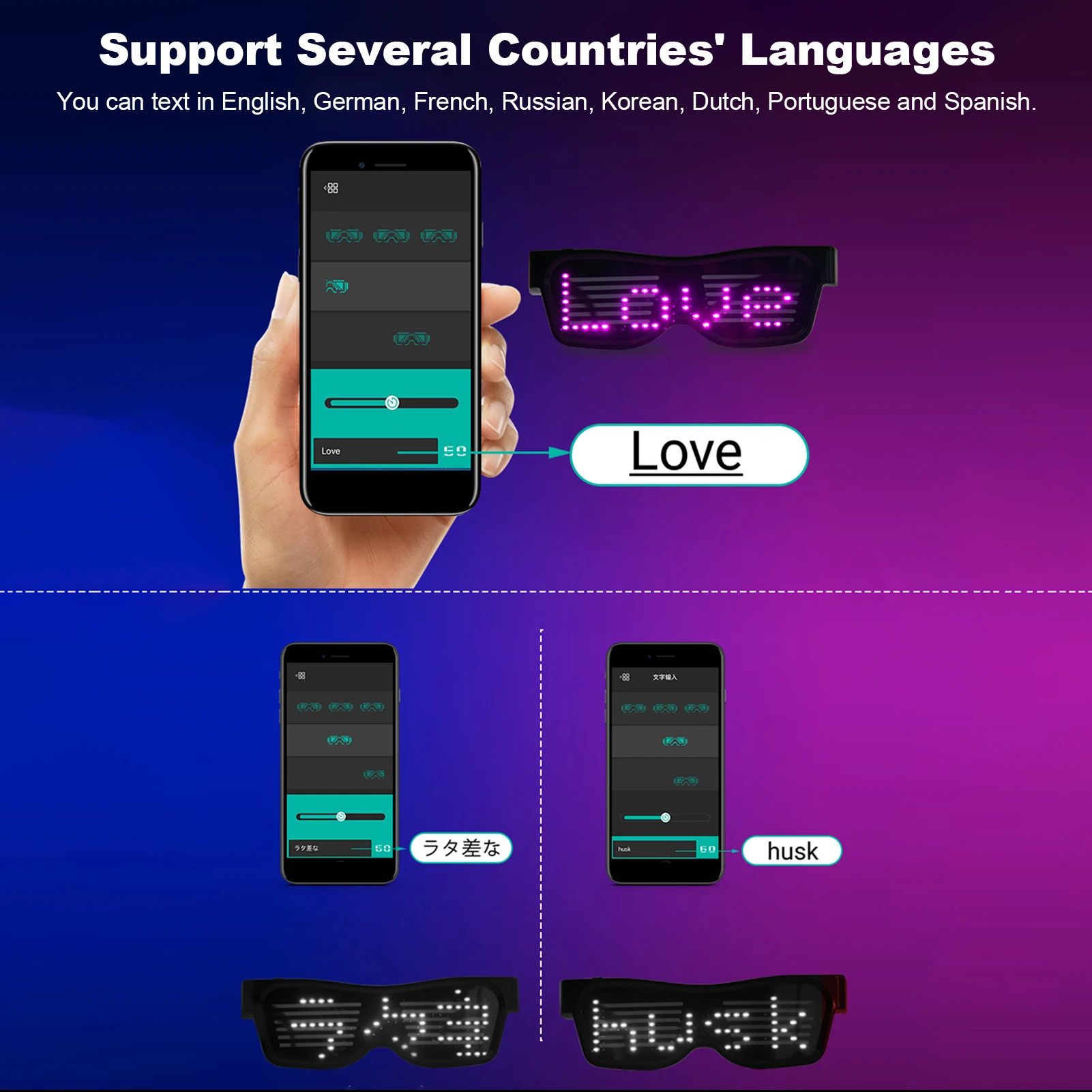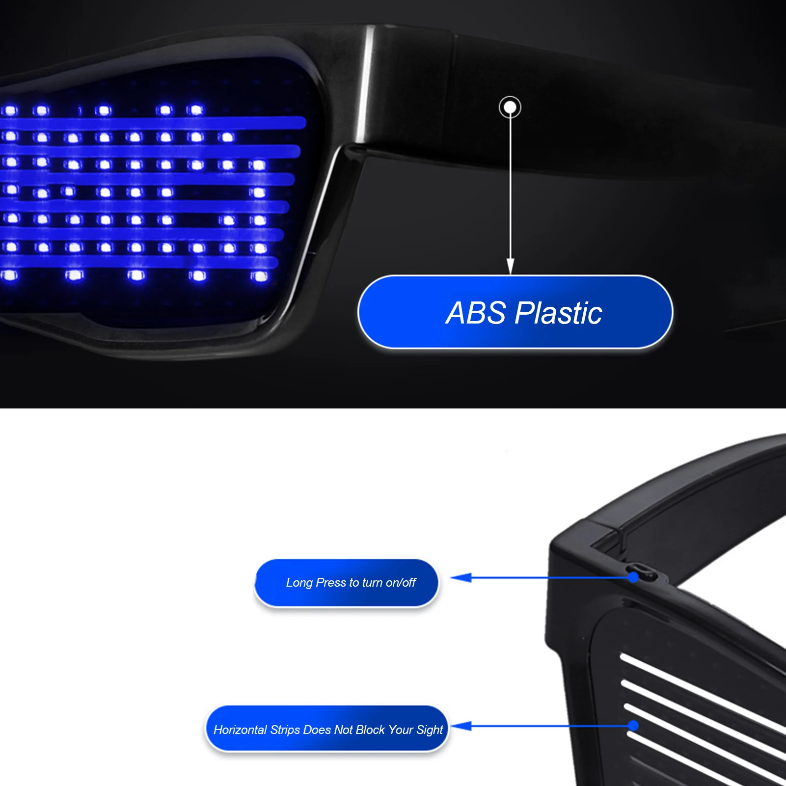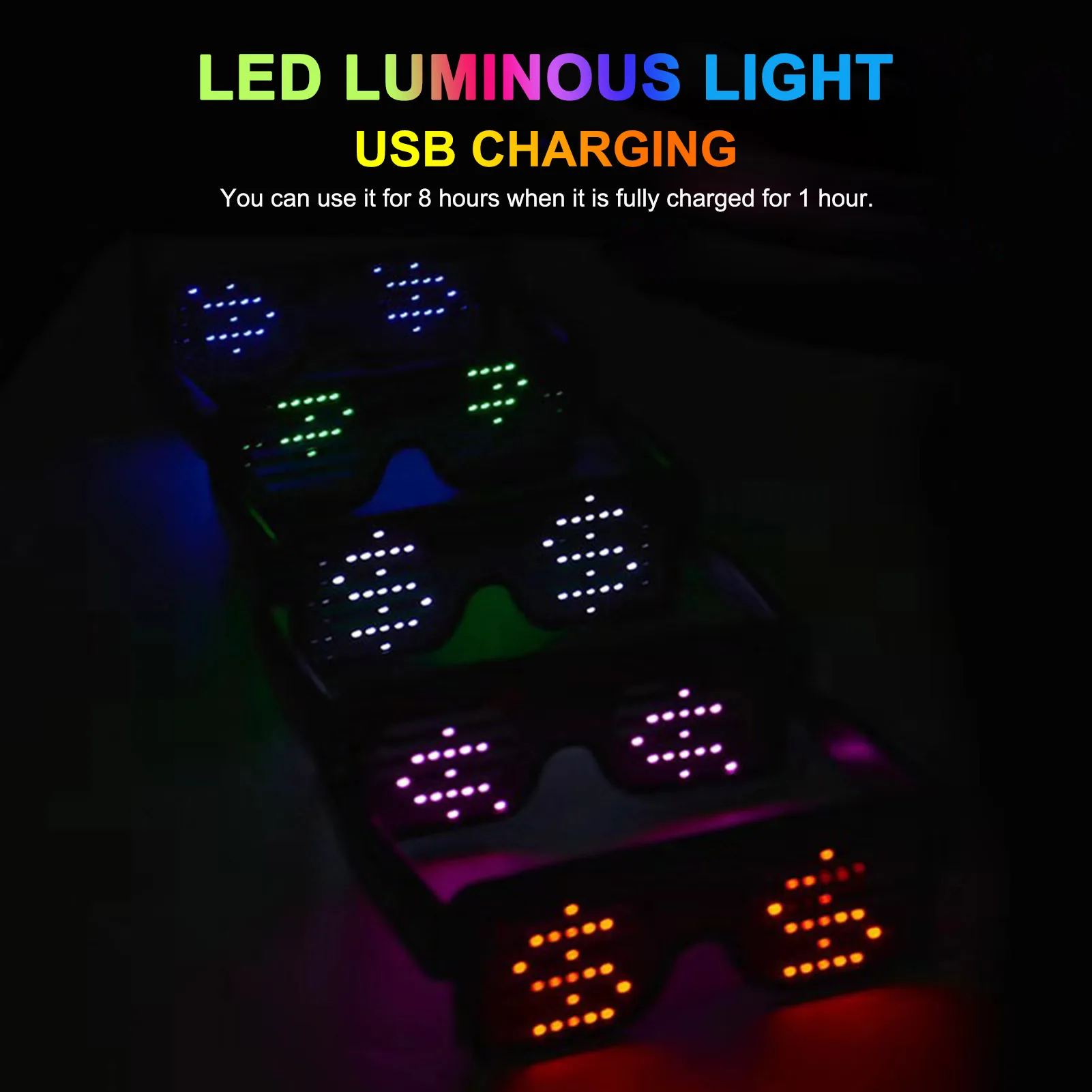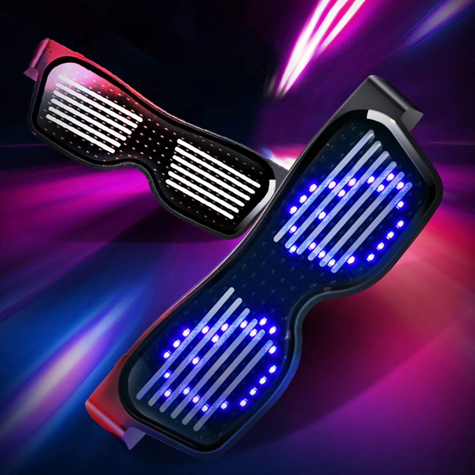 Простота в эксплуатации, 8 моделей:Длительное нажатие может начинаться и закрываться, а короткое нажатие может переключаться на узоры. Двойной щелчок позволяет петлить анимационный узор и удерживать кнопку вниз, чтобы выключить очки.Есть 8 видов узоров, включая мигание, скелет, поцелуй, сердцебиение, доллар, стрелу, сердцебиение и фейерверк. Вы можете выбрать тот, который вам нравится.
