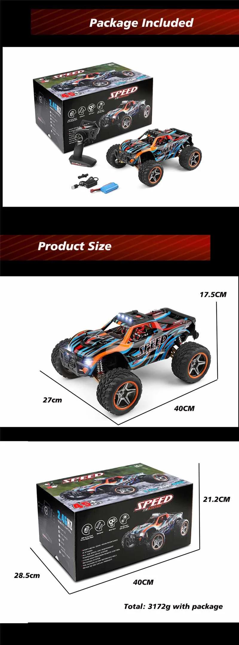 1. Новейший автомобиль wltoys 104009, максимальная скорость 45 км/ч, его размер 38*28*20 см.