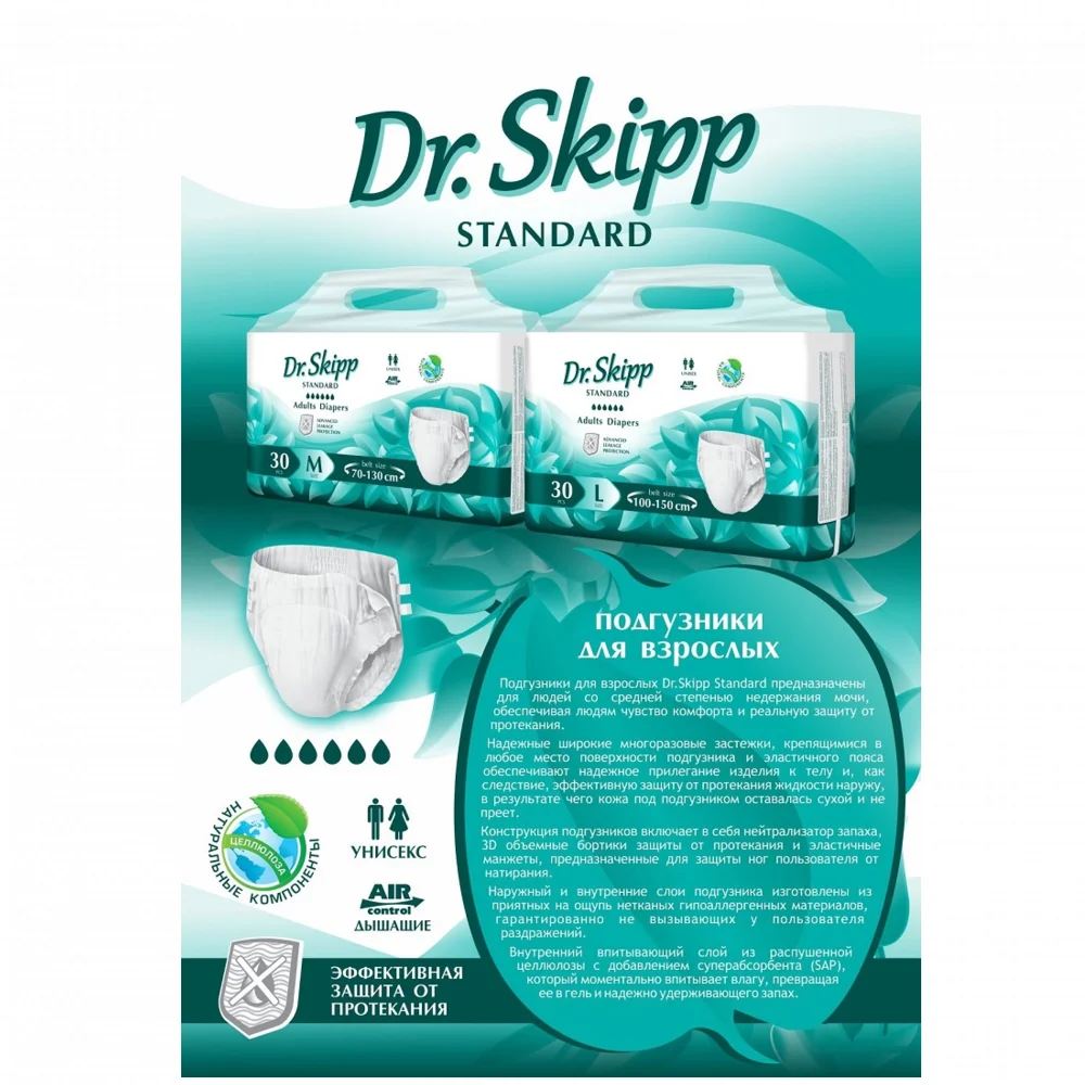 Подгузники для взрослых Dr.Skipp Standard предназначены для людей со средней степенью недержания мочи, обеспечивая людям чувство комфорта и реальную защиту от протекания.