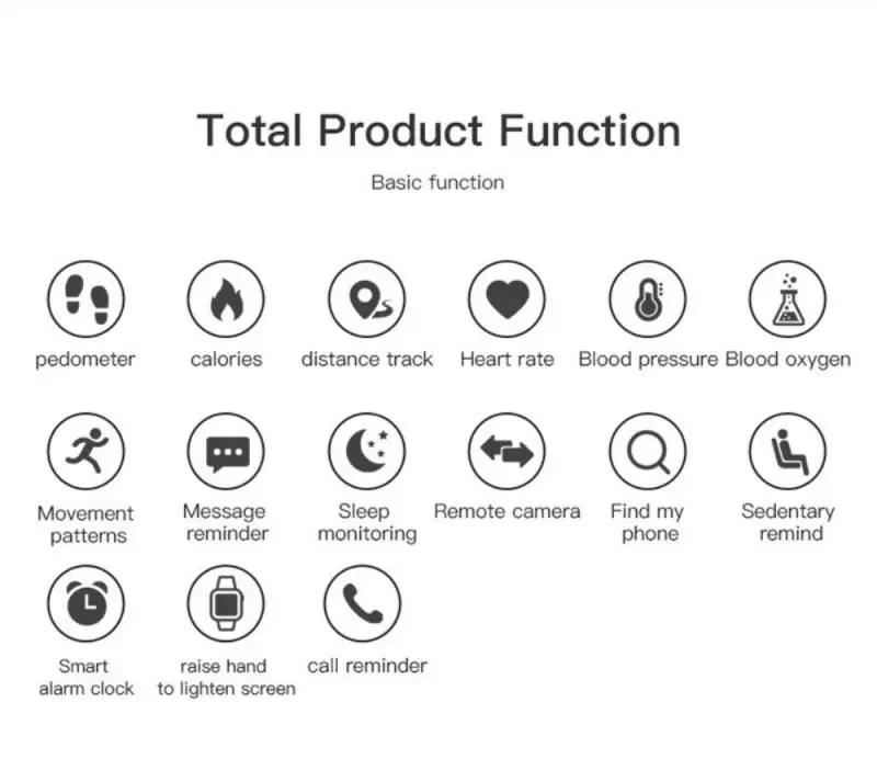 Functions: Alarm setting, Sedentary reminder, Heart rate monitor, Pedometer, Sleep monitor, Call/message reminder, Search for phone, Hand raise to light up, Remote camera and more.