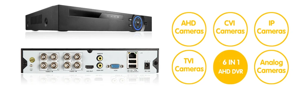 Вы можете свободно наслаждаться шестью режимами подключения с помощью этого многофункционального цифрового видеомагнитофона. AHD (аналог высокой четкости)-новая передовая технология домашней безопасности с 5 режимами записи. Для вашего варианта: Аналог/AHD/Сеть/TVI / CVI / AHD + сеть. Вы можете получить видео высокого качества в каждом режиме.