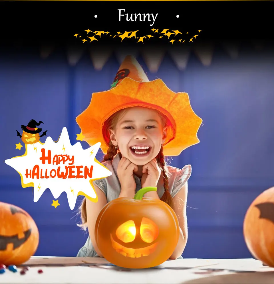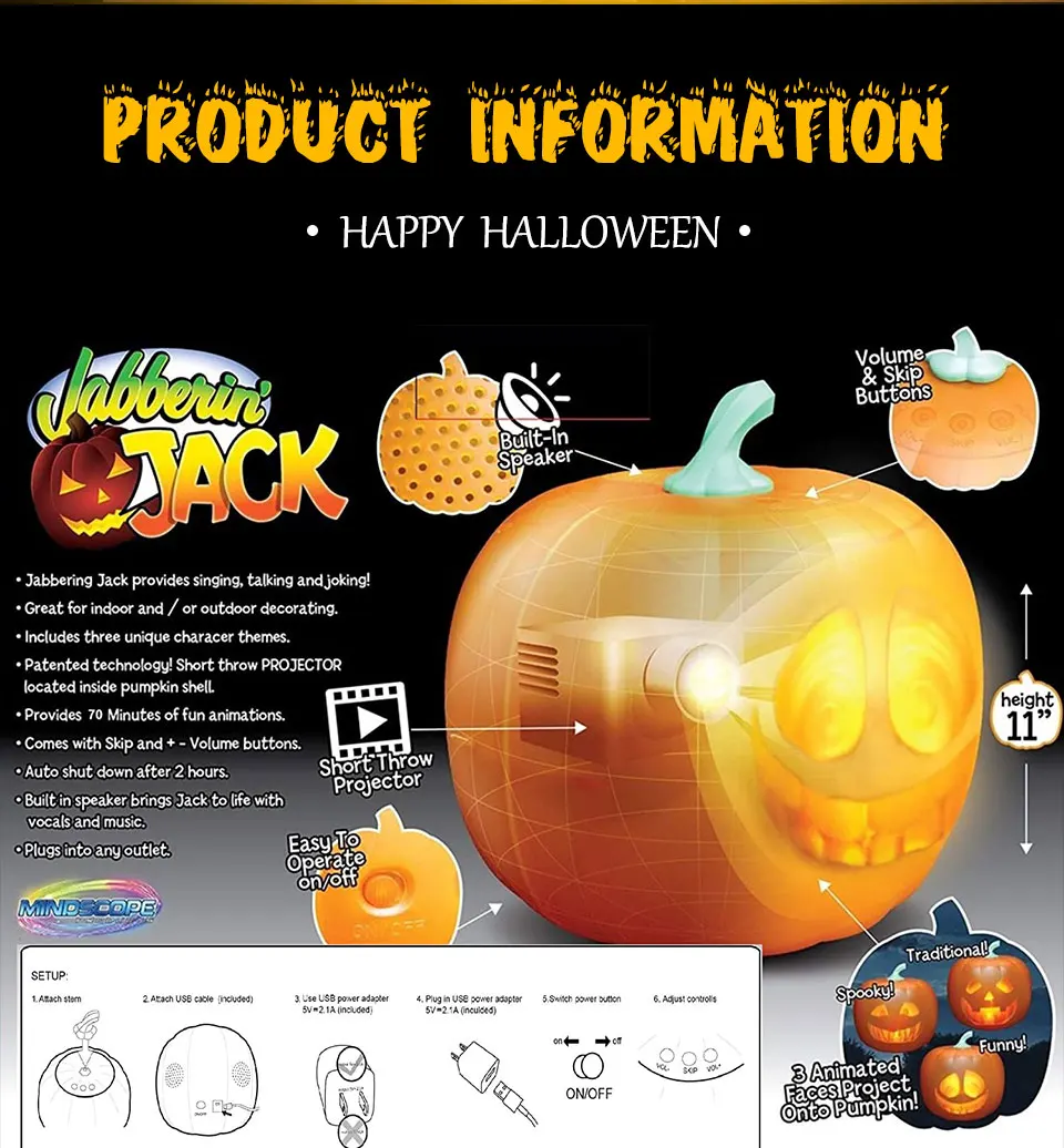 3. Встроенный динамик тыквы можно услышать с любого расстояния. Сделайте производительность тыквы более реалистичной. Джек-о-фонарь имеет 40 популярных шуток, которые заставят вас смеяться. Интересная анимация более 70 минут. Проектор коротких бросков в раковине тыквы технологически продвинута!