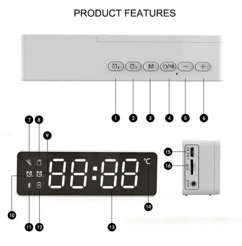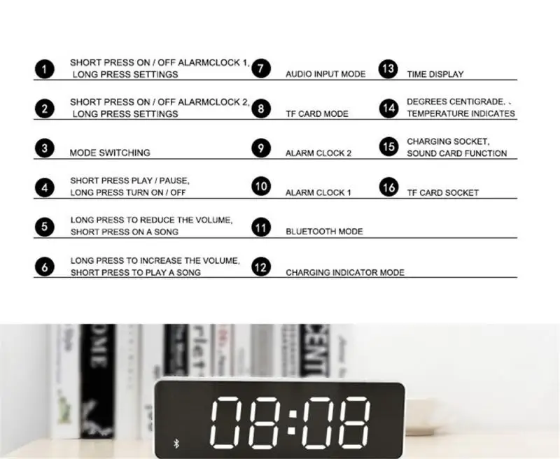 Функция: Bluetooth аудио/часы/будильник/дисплей температуры/чтение tf-карты