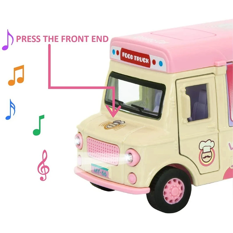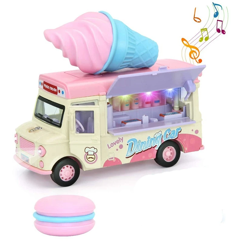 This food truck is equipped with lights and music, flashing lights and beautiful music.