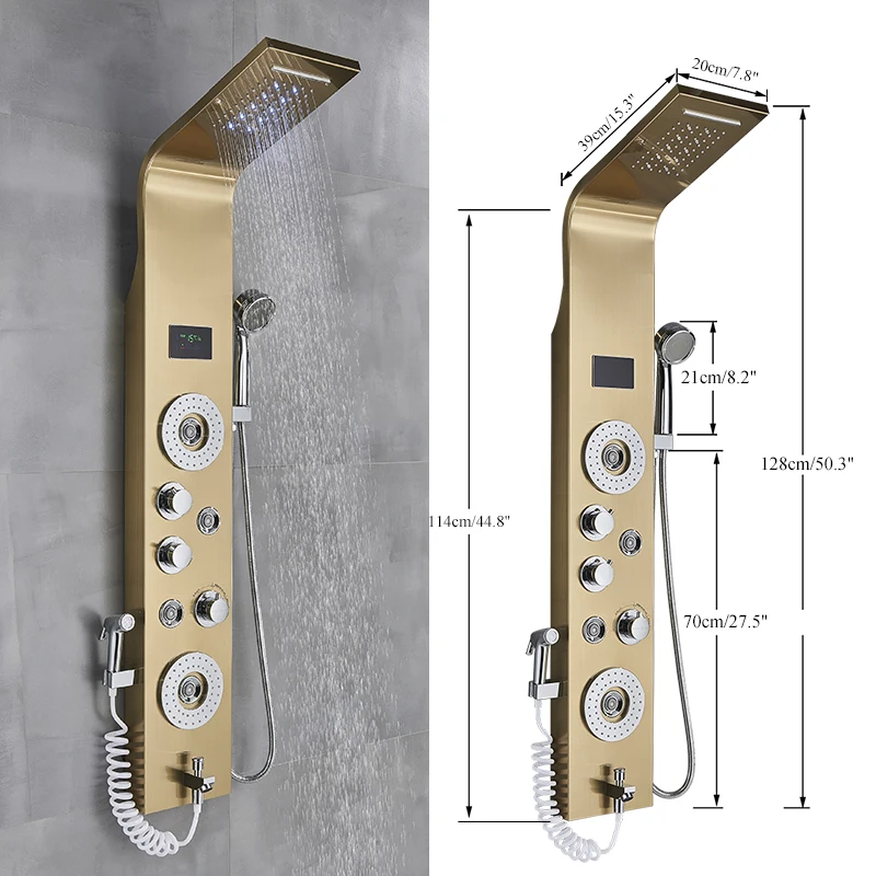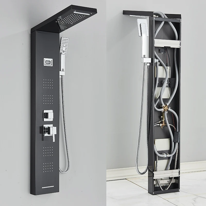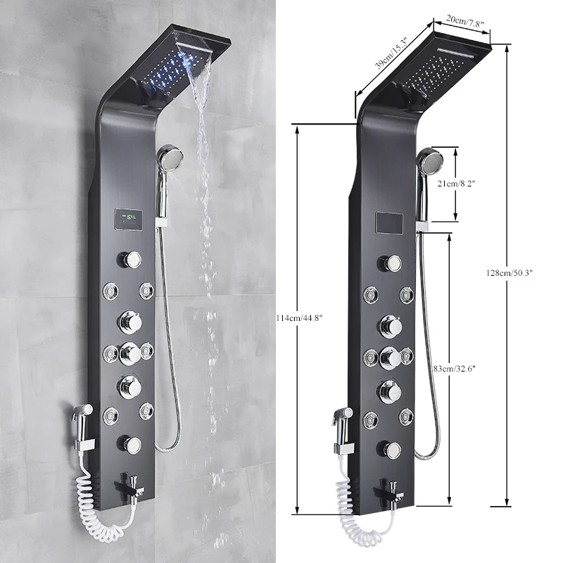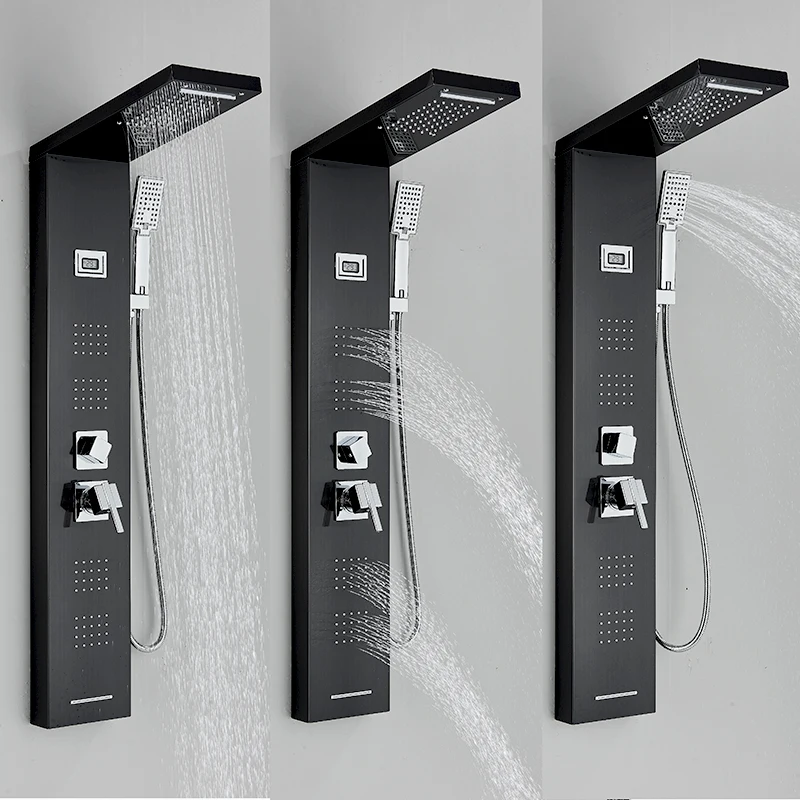 Black LED Light Shower Panel Rainfall or Waterfall ShowerHead SPA Massage Jet Bathroom Shower Column System Bidet Sprayer Faucet