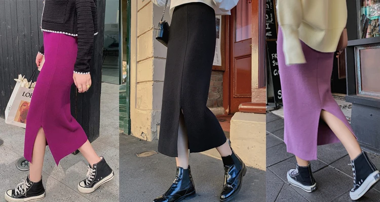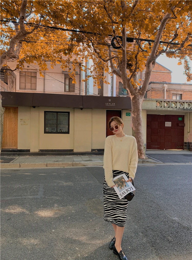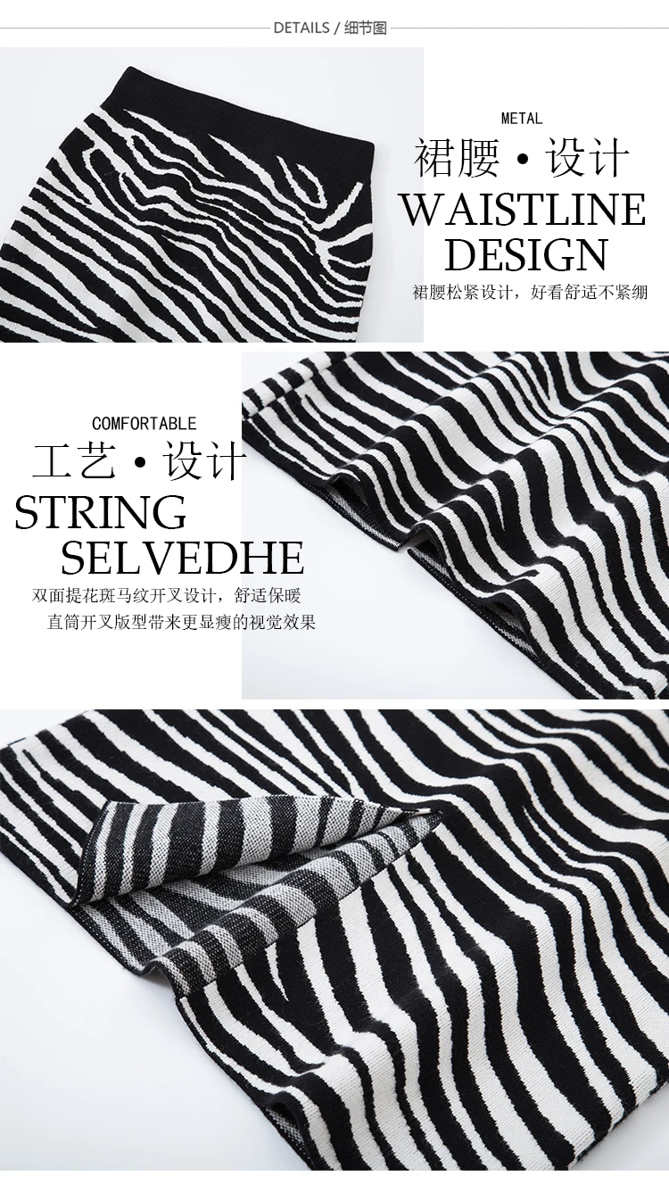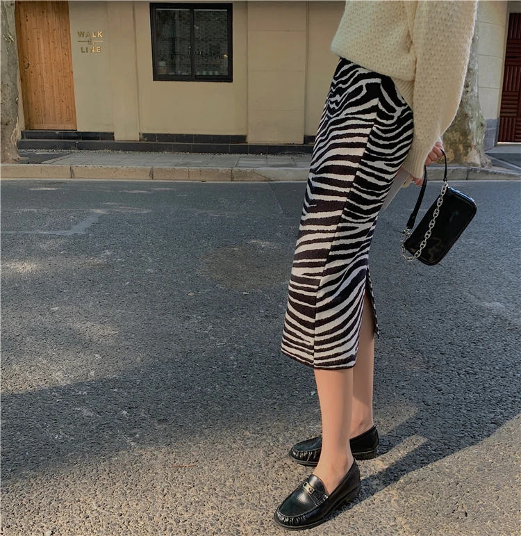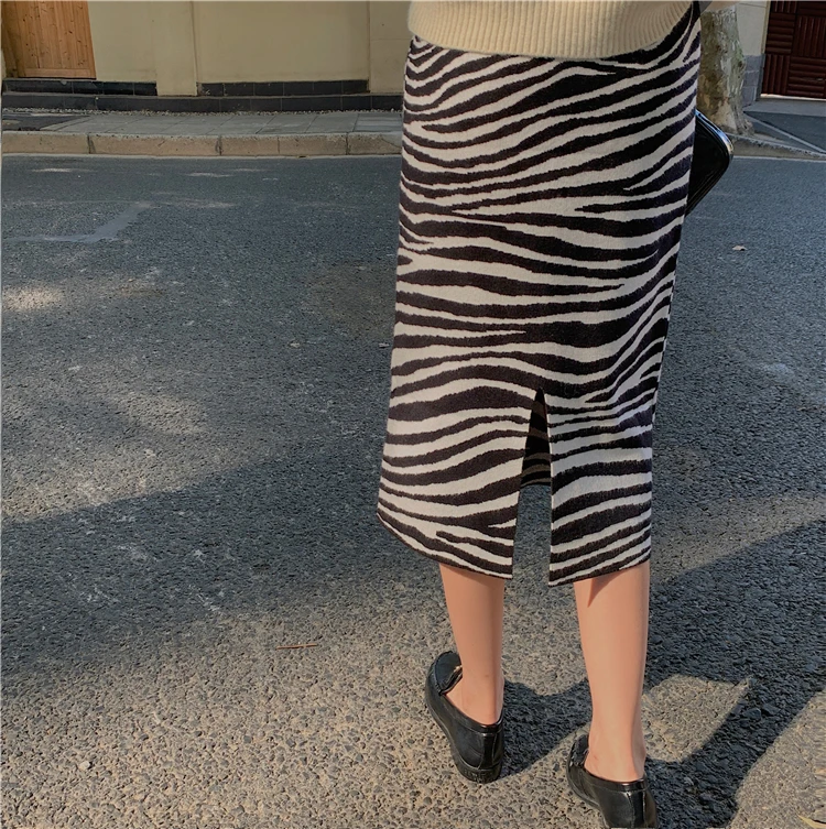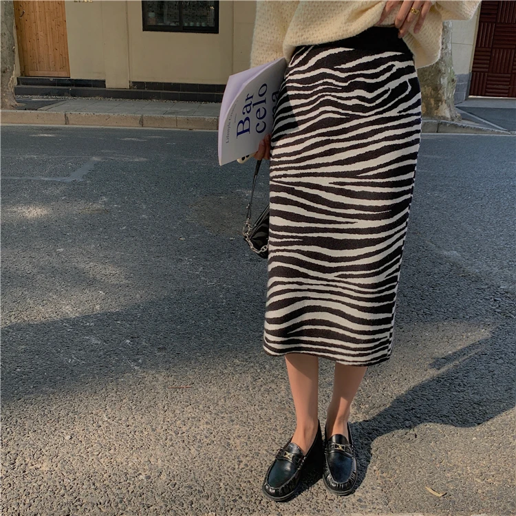 Женская трикотажная юбка-карандаш TingYiLi, черно-белая Теплая юбка средней длины в полоску с высокой талией в Корейском стиле, Осень-зима