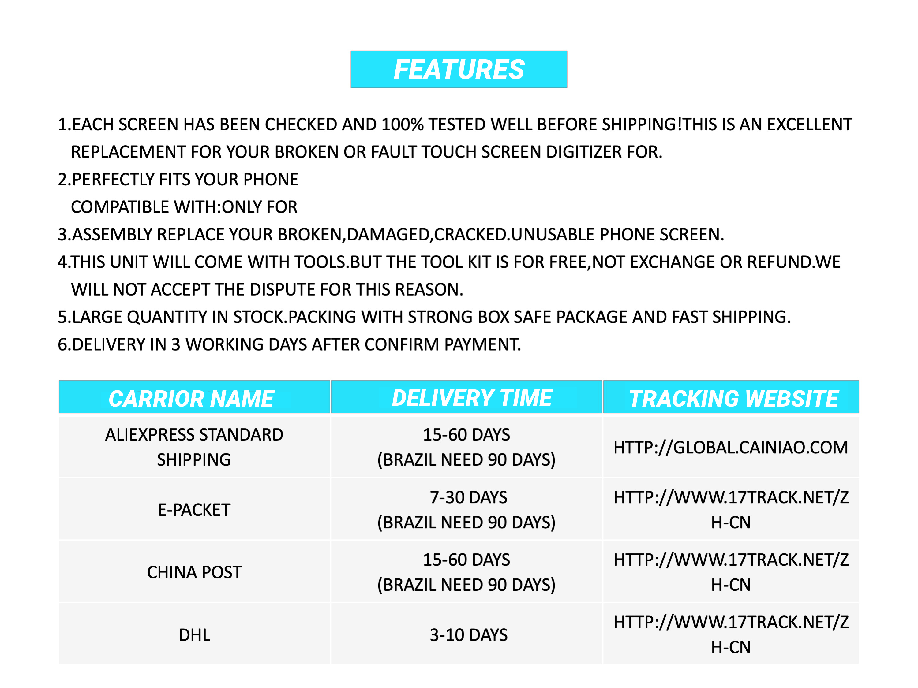 Посылка включает: 1xlcd + 1 набор инструментов Уровень качества: A + + +. Бесплатные инструменты для ремонта включены. 100% работоспособность, тестирование 3 раза перед отправкой. Функция: замена экрана для ремонта трещин. /Разбитый экран. Также решаем отображение/касание. Проблемы, битые пиксели и неправильный цвет. Примечание: Пожалуйста, проверьте его перед установкой экрана. Это очень важно для гарантии. У экрана есть проблемы, если вы обнаружили, что у вас есть какие-либо проблемы перед установкой, мы можем заменить для вас. Если у вас есть какие-либо проблемы, пожалуйста, свяжитесь с нами. Перед установкой экрана убедитесь, что у вас достаточно опыта установки. Очень важно