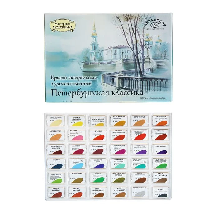Профессиональные акварельные краски "Петербургская классика" представляют собой тонкодисперсные суспензии светостойких пигментов и наполнителей в связующем, состоящим из водного раствора гуммиарабика с добавками бычьей желчи и консервантов. Высокое качество нашей акварели удовлетворит как профессиональных художников, так и делающих первые шаги в живописи.