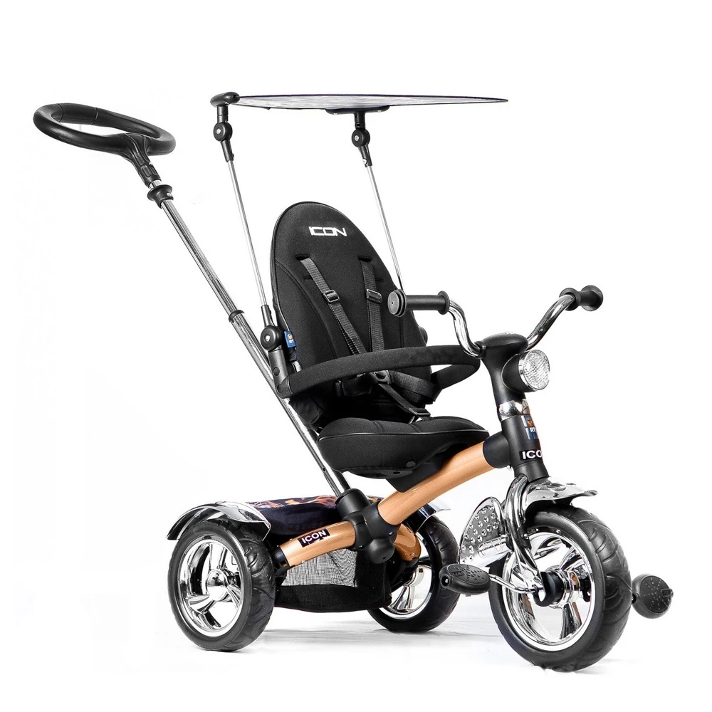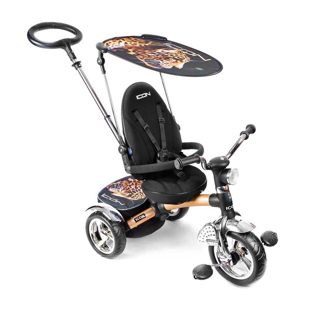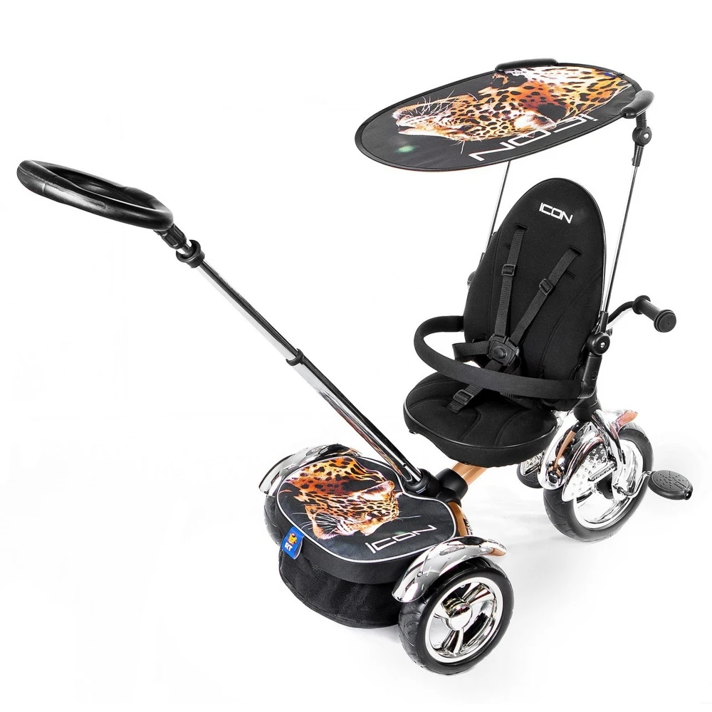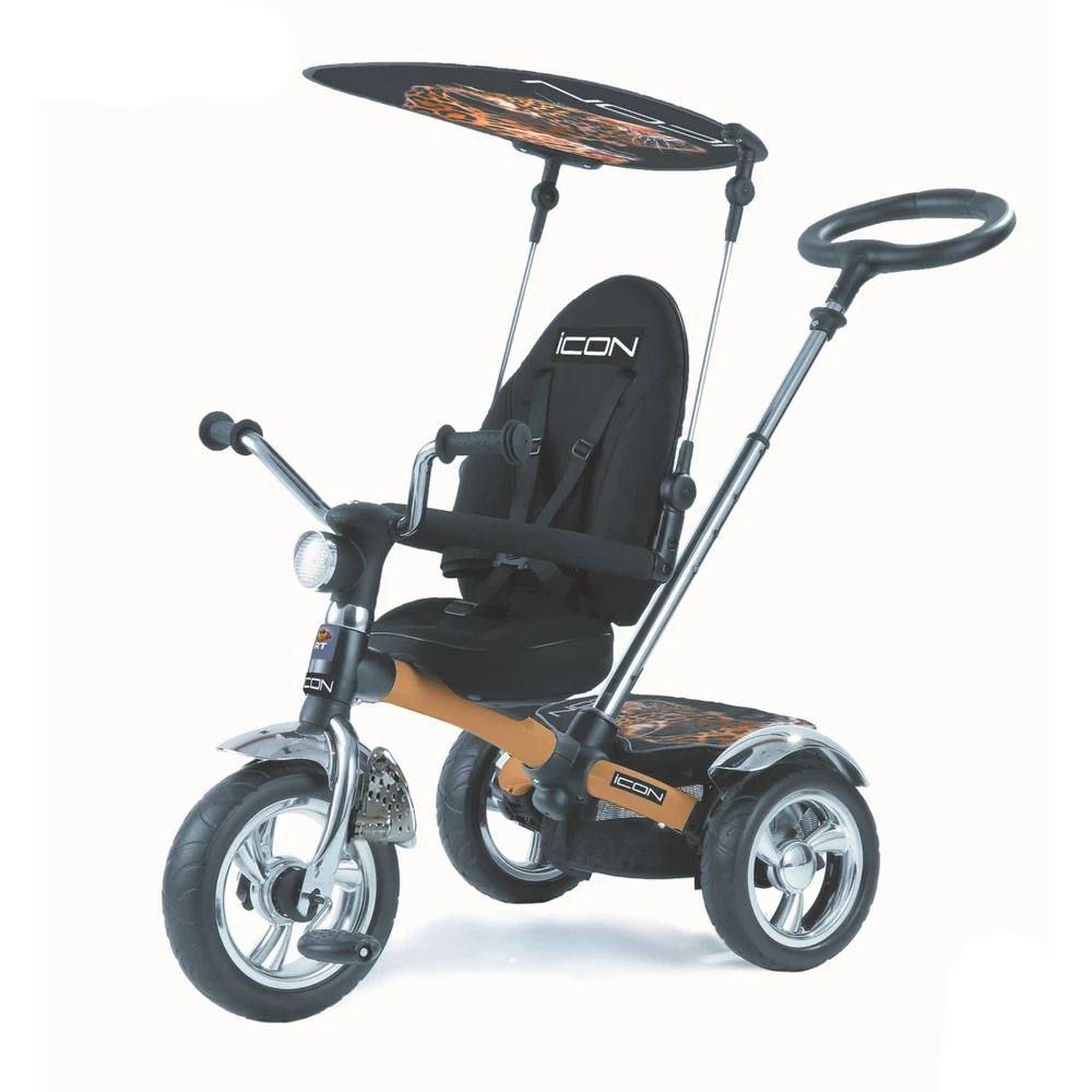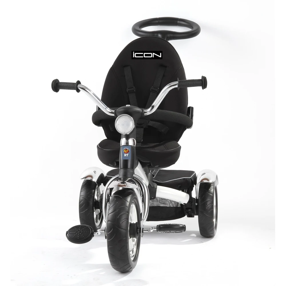 Велосипед-коляску можно использовать для детей от 6 месяцев. У модели Icon 3 RT original - непрокалываемые колеса EVA + большое сиденье. Сиденье можно наклонить до положения не только полулежа, но и совсем лежа, повернуть лицом к маме или лицом к дороге. Но в то же время Вы сможете использовать этот велосипед до 5 лет. Очень длинная и удобная телескопическая родительская ручка установлена под идеальным углом и подходит под любой рост взрослого. Ручка перемещается легко и быстро, достаточно только двумя пальцами нажать на верхнюю деталь основной ручки. Теперь Вы можете преодолевать бордюры и одновременно поворачивать велосипед направо и налево. Мощный технически продуманный узел на раме теперь позволяет это делать. Сиденье имеет 8 положений ближе или дальше от руля. Вы удивитесь, как двигается сиденье по полозьям легко и непринужденно. Вам достаточно только лишь нажать 2 кнопки под сиденьем и передвигать его ближе или дальше от руля. Легким движением руки Вы можете снять сиденье и развернув его на 360 градусов установить "лицом к маме". Или развернуть наоборот - "лицом к дороге". А наклонить сиденье до уровня лежа-полулежа можно всего одной рукой и одним нажатием. Уникальность Icon - его легкая и быстрая сборка - "до щелчка". Инструменты не нужны! Все что вам нужно - это довести все этапы сборки "до щелчка". На задние колеса установлены амортизаторы, которые дают плавность хода. Вы не почувствуете неровности дороги. А малыш сможет спокойно прыгать на сиденье. Функция - “свободное колесо”. Пластиковый диск расположен на переднем колесе. Небольшим усилием Вы можете вытаскивать диск наружу или ставить на место. Таким образом, Вы фиксируете педали и малыш может кататься на велосипеде, а можно дать им свободный ход и крутить педали взад - вперед, когда велосипедом управляет взрослый. Уникальные подножки-крылья может закрывать и открывать малыш самостоятельно, без помощи мамы: закрывать, когда они не нужны и раскрывать, когда ножки малыша устали. Они установлены на вилке переднего колеса. Размеры велосипеда: длина: 88/135/128 см (с 3-мя разными положениями ручки управления), ширина задних колес: 53 см, высота ручки управления: 95/87 см, высота от земли до сиденья: 37 см, высота от земли до руля: 58 см.