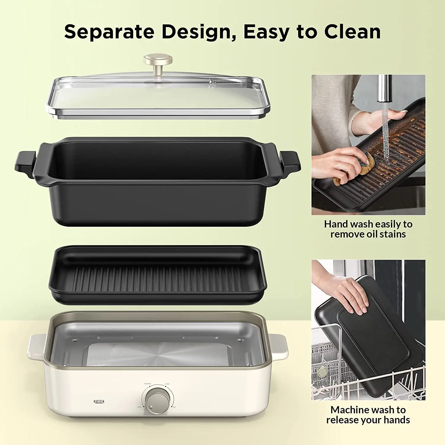 Эта электрическая сковорода имеет здоровое и экологически чистое антипригарное покрытие по сравнению с обычной кухонной утварью. Это позволяет пище легко отделяться от кухонных поверхностей и значительно снижает затраты на очистку. Все аксессуары безопасны для посудомоечной машины, Очистите свою электрическую сковородку менее чем за минуту! Его компактный дизайн легко хранить и не занимает слишком много места.