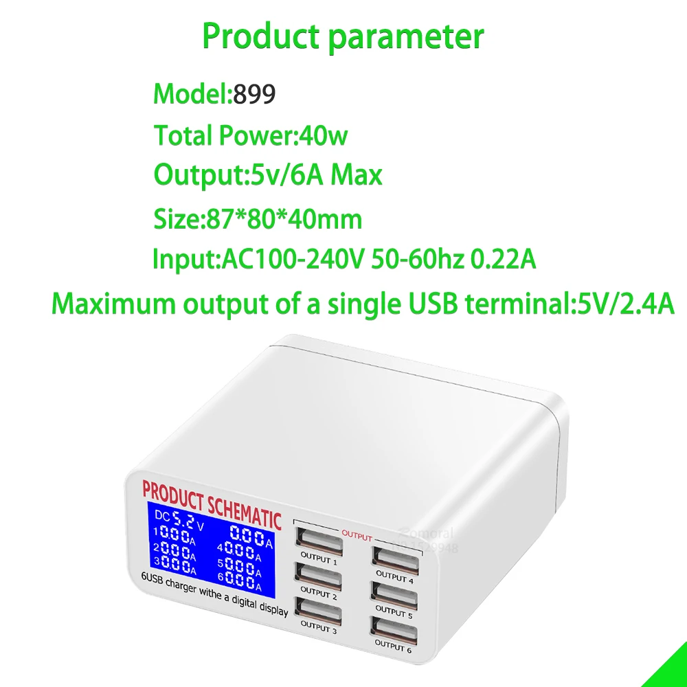 8A QC3.0 USB зарядное устройство с ЖК-дисплеем 6 портов Настольный мобильный телефон зарядное устройство умная Быстрая зарядка для смартфонов планшетных ПКНапоминание: продукт разделен на 2 спецификации. Пожалуйста, заказывайте по мере необходимости. Эта цена не включает налог. Спасибо.(1) Модель: 896ЖК-дисплей: Отображение напряжения и токаВходное напряжение: 100-240 В переменного токаВходная частота: 50-60 ГцВыходное напряжение: 5 ВВыходной ток: 8АВыходная мощность: 40 ВтВыходное напряжение QC3.0: 5 В/9 В/12 ВВыходная мощность QC3.0: 3.4A/2A/1.5AДлина кабеля: 1500 ммЭффективность работы: 70%Метод рассеивания тепла: безопасный теплоотвод алюминиевый листАвтоматическое распознавание: автоматическое распознавание тока в соответствии с оборудованиемМаксимальный выход одного порта 2.4AМатериал: PC + ABS огнестойкийЦвет: белый(2) Модель: 899ЖК-дисплей: Отображение напряжения и токаВходное напряжение: 100-240 В переменного токаВходная частота: 50-60 ГцВыходное напряжение: 5 ВВыходной ток: 8АВыходная мощность: 40 ВтДлина кабеля: 1500 ммЭффективность работы: 70%Метод рассеивания тепла: безопасный теплоотвод алюминиевый листАвтоматическое распознавание: автоматическое распознавание тока в соответствии с оборудованиемМаксимальный выход одного порта 2.4AМатериал: PC + ABS огнестойкийЦвет: белый