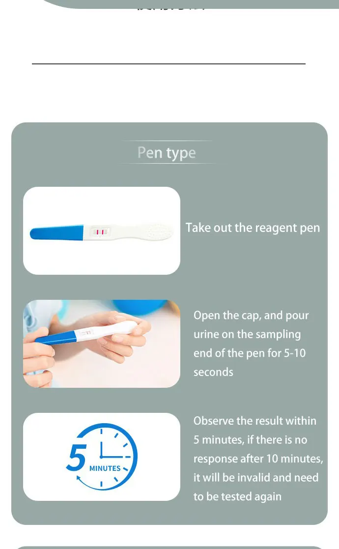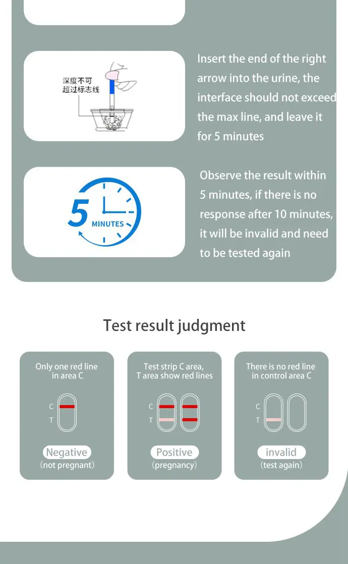 4. ① если есть только красная линия в положении буквы C и нет красной линии в положении буквы T, это означает, что нет беременности. ② Если красные линии появляются как в области букв C, так и в области T, это означает беременность. ③ Если в области буквы т есть только красная линия, а в области буквы C Нет красной линии, это означает, что тест недействителен, и тест должен быть повторно протестирован.