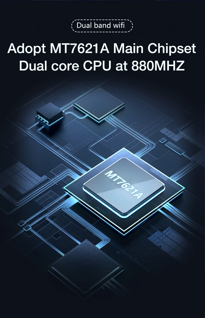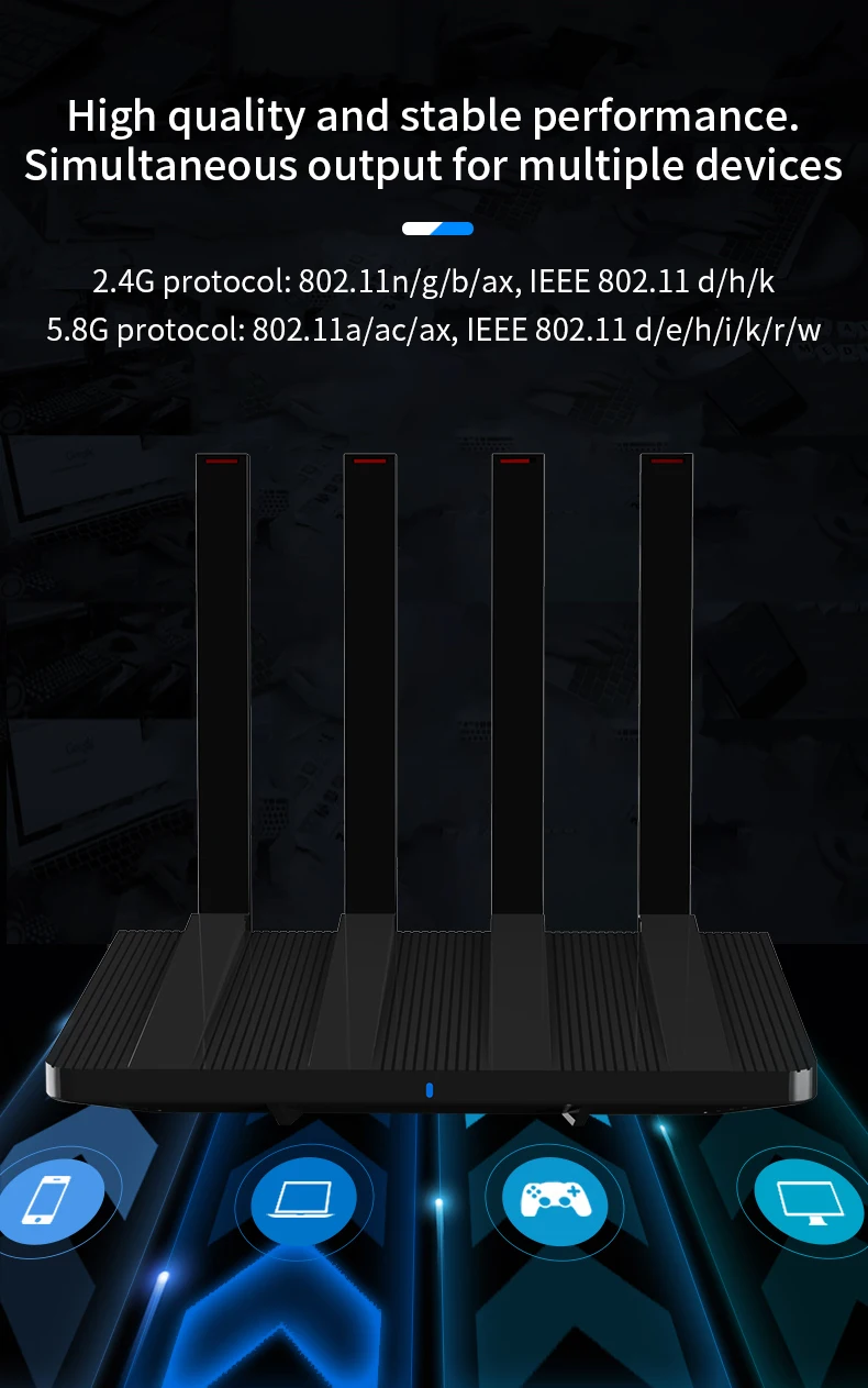 Чипсет MT7621A, двухъядерный процессор MIPS, основная частота до 880 МГц с использованием независимого чипа WIFI6,MT7905D и MT7975D,Скорость до 1800 Мбит/с использованием высокоскоростной 256 Мб DDR3,С 16MB Nor Flash 1LAN + 4 LAN 1000M самоадаптивный порт, поддержка Auto MDI / MDIX.Поддержка режима вспышки в один клик,Пользователи могут легко войти в режим восстановления с поддержкой интерфейса USB3.0,Его можно использовать для расширения внешнего usb-накопителя с высоким коэффициентом усиления всенаправленной антенны,Покрытие беспроводного сигнала угол 360 градусовУпаковочный лист