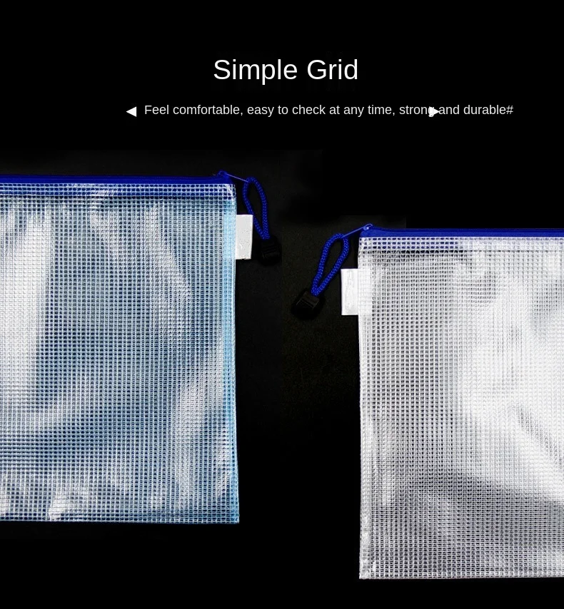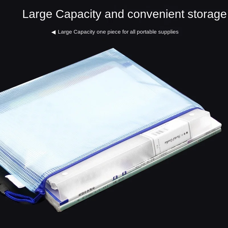 Подходит для резки и наклеивания документов, газет и журналов. Его можно хранить аккуратно без пробивных отверстий. Сумка на молнии имеет полупрозрачный дизайн, и отверстие имеет пластиковую застежку-молнию, которая может предотвратить потерю предметов внутри. Пространство внутри большое. Он может хранить все виды документов, материалов и других обучающих и офисных принадлежностей и подходит для обучения, офиса и подарков. Сетчатый мешок на молнии изготовлен из высококачественных материалов для защиты окружающей среды и изготовлен из спецификации формата А4. Материал имеет характеристики воздухопроницаемости, износостойкости, высокой термостойкости и коррозионной стойкости, которая подходит для школ, предприятий, единиц и других мест.