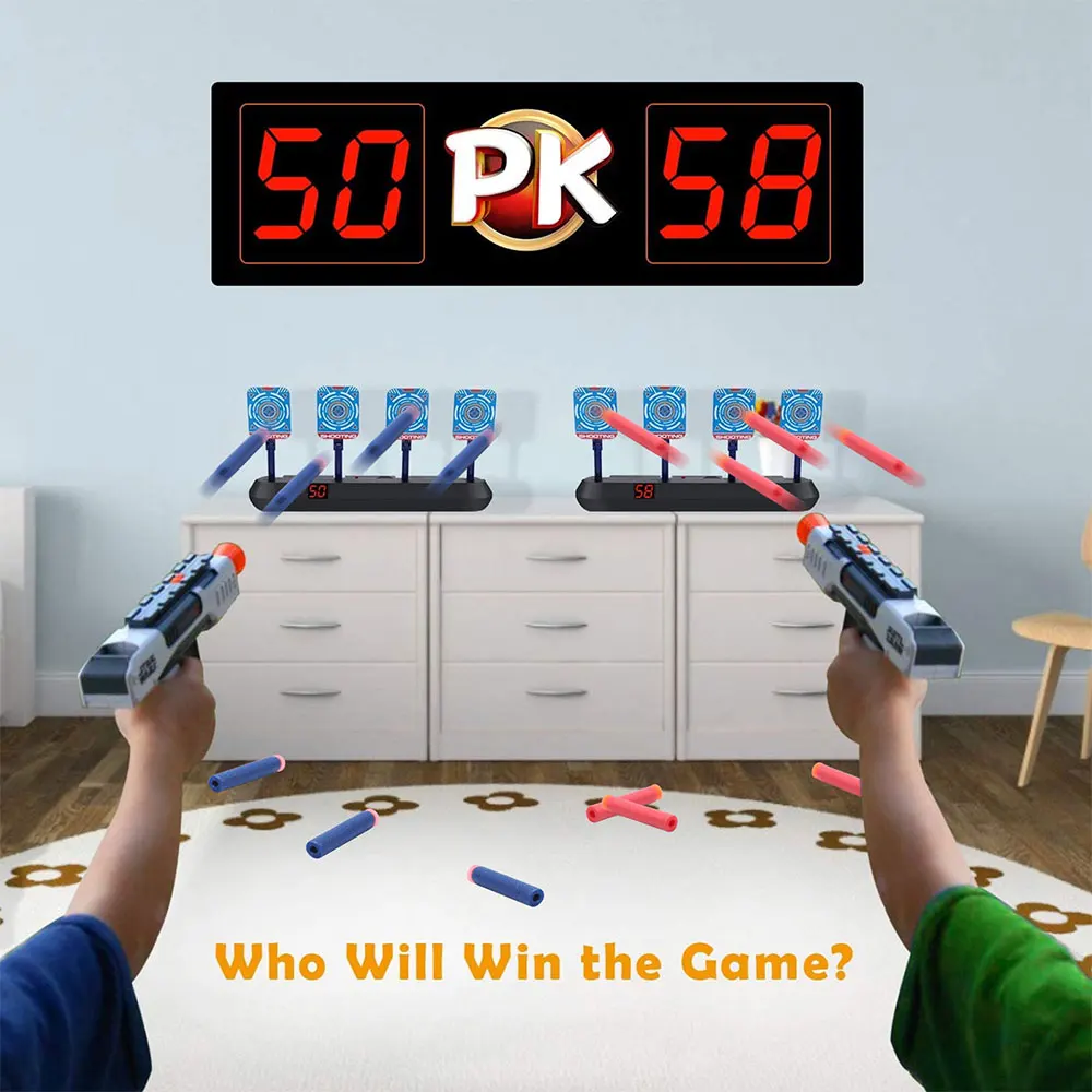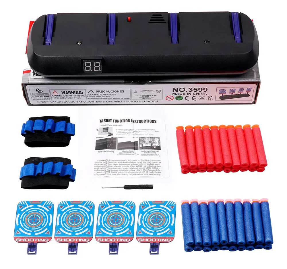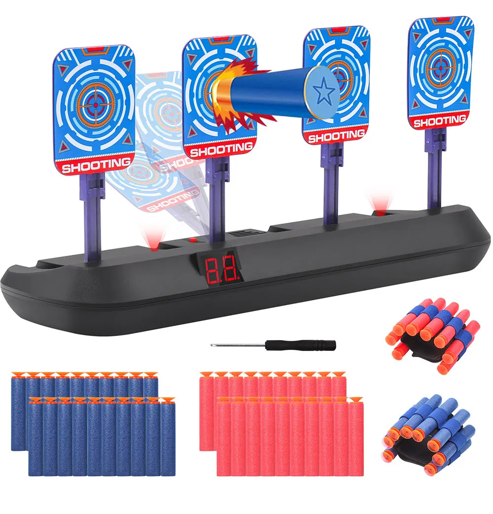 1. Цель электрической стрельбы: цифровая табло отслеживает и отображает результаты, она будет падать, когда ударит по цели и ударит 4 цели, чтобы получить одну точку. Идеально подходит для серии Nerf N-strike Elite.
