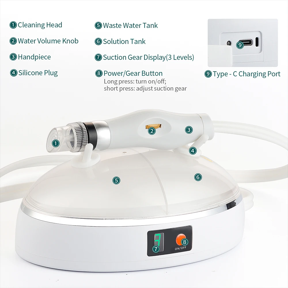 Особенности 3 сукции для обработки различных типов кожи и различных целей очистки, и свободно регулируемый объем воды, который может настроить чистку и увлажняющие эффекты.