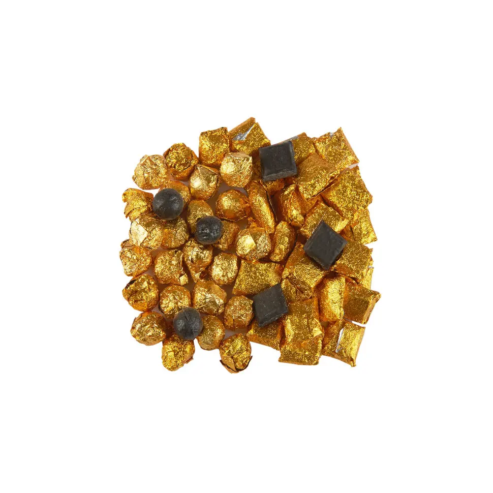 Темная, квадратной/прямоугольной или шарообразной формы таблетка смолы, аккуратно завернутая в тёмную фольгу.