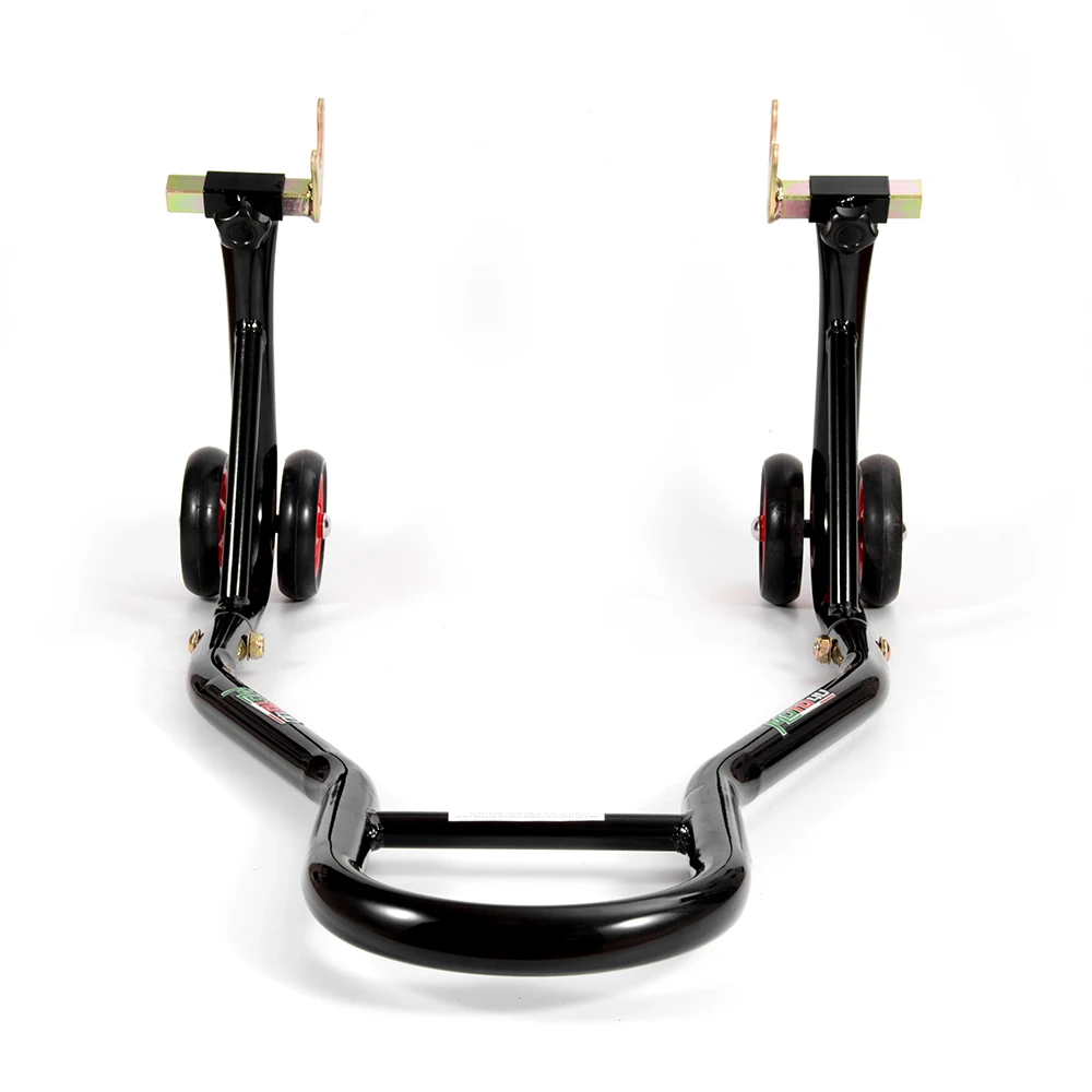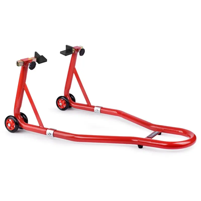 There are four larger casters, you can lift the bike lightly and smoothly.