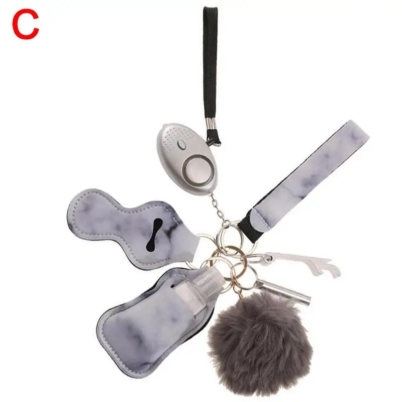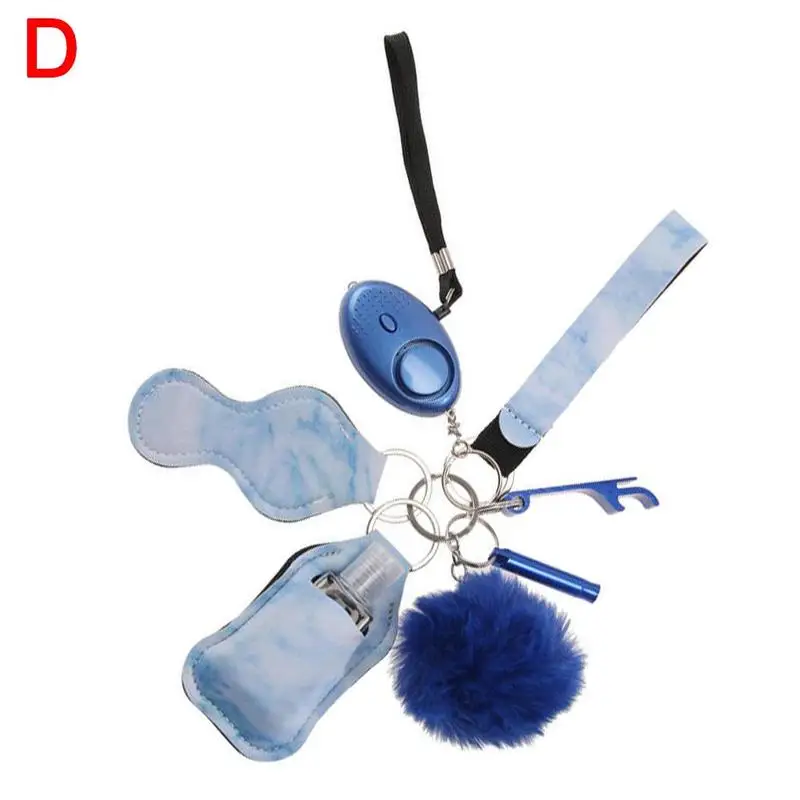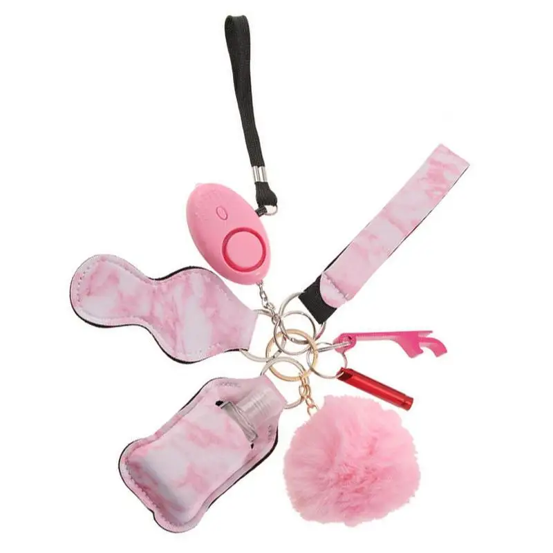 Уникальный Набор Ключей Безопасности из 9 элементов включает ремешок на запястье, будильник 130 децибел с фонариком, открывалка для бутылок, ручной держатель для чистки пустых бутылок 30 мл, держатель для помады, выключатель окна, помпон и свисток.