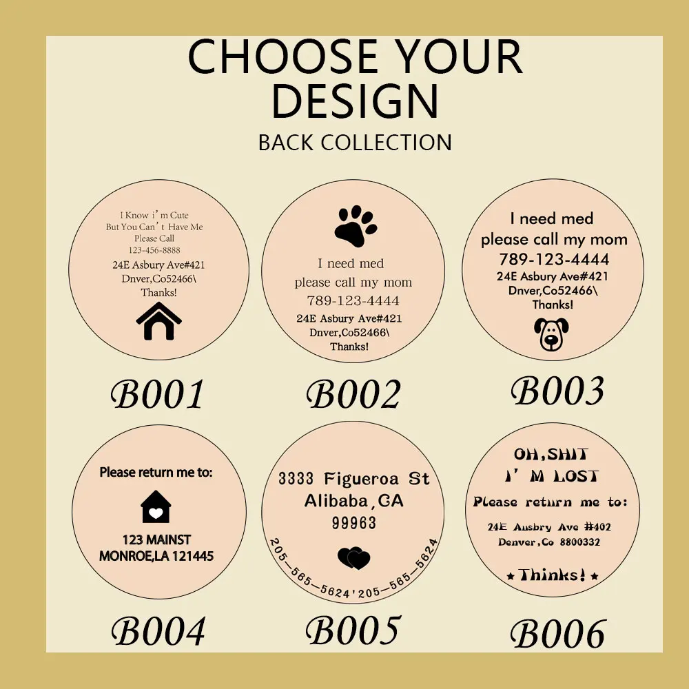 ✎Этот список предназначен для одной бирки и может быть штампован спереди и сзади. Передняя часть включает в себя имя питомца, шаблон и заднюю часть включает в себя адресную информацию и номер телефона.