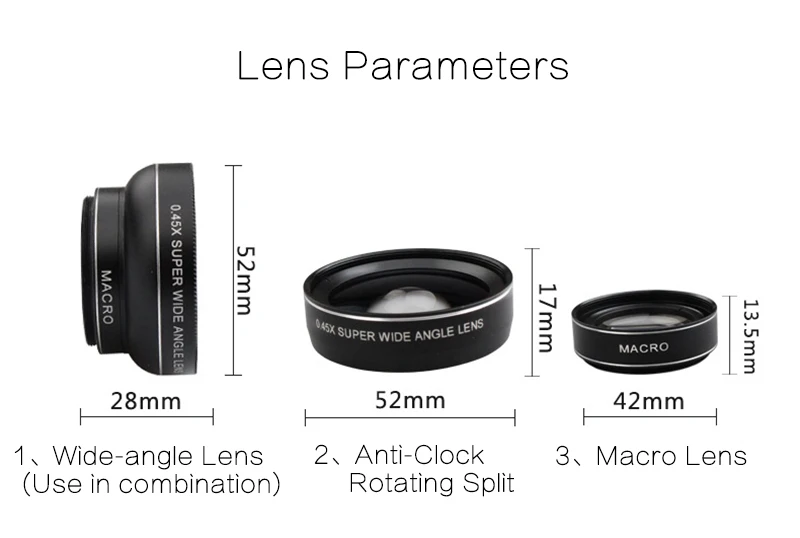 This is a 2 in 1 tiny clip-on detachable HD lens for mobile phones & digital cameras. With the macro lens, can be taken picture of a tiny object clearly in the details. Wide angle lens is suitable to take picture of large ranges, such group of people, buildings and landscape. New design universal clip can attach every 37MM Thread Digital SLR Pro Lens on your mobile. Turn your mobile into DSLR Camera easily. Bigger than bigger. Professional HD Lens reduces glass flare & ghosting caused by reflections. Top-grade aluminum construction increases the durability of the product and let APEXEL Lens Kit be your partner of photography. Universal detachable clamp design, work on most types of mobile phone that their camera lenses are not bigger than 13mm diameter. Suitable for most mobile phones, easy and convenient to operate. It can apply to iPhone, HTC, Samsung, smart phone, iPad, Tablet PC or anywhere you can imagine. NOTE: 1.when use Macro Lens, suggest keeping 1-2cm distance from your object to take more clear pictures. 2.The Macro Lens and the Wide Angle Lens are attached together while you receive them. Note: This listing is for the lens only, mobile phone is not included The Flash Light will be blocked when the lens is in use. Package include: 1 x wide angle lens¯o lens 1 x universal clip 1 x Black Bag0.45x wide angle lens-----allow you capture more landscape than normal, it is great for cityscapes and large group photos.