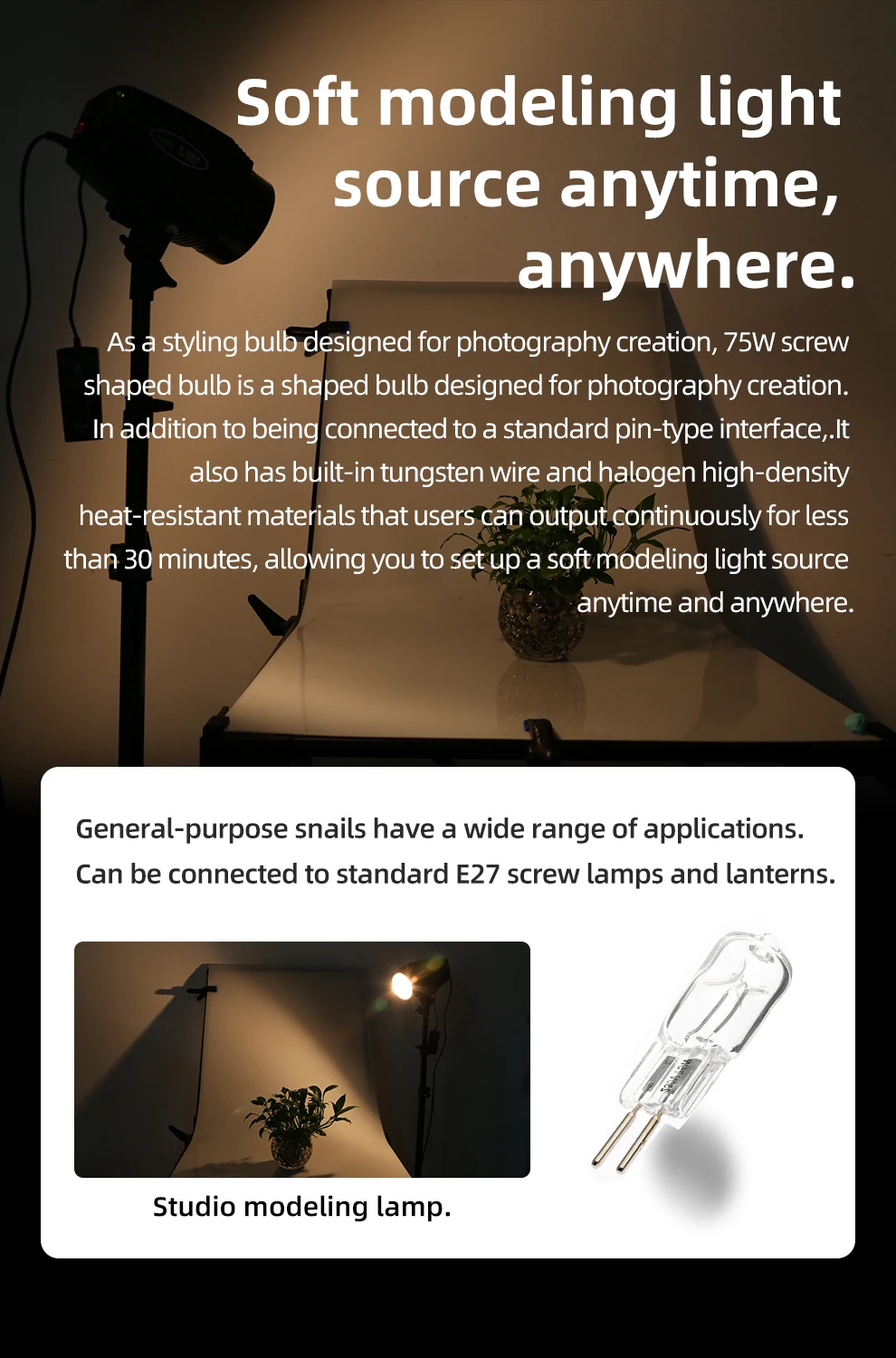 Информация о товаре Эта моделирующая лампа мощностью 75 Вт широко используется в компактных конструкторах (например, Godox 250DI). Спецификация Мощность: 75 Вт Напряжение: 110 В ~ 240 В Вес: 5g Размер: 1,3 см x 1,3 см x 4,5 см Содержит 75 Вт моделирующая лампа для стробоскопа/вспышки (опционально) Подходит для: Godox K150A , 200DI, 300DI ,K180A, 250DI, 250SDI.300SDI,