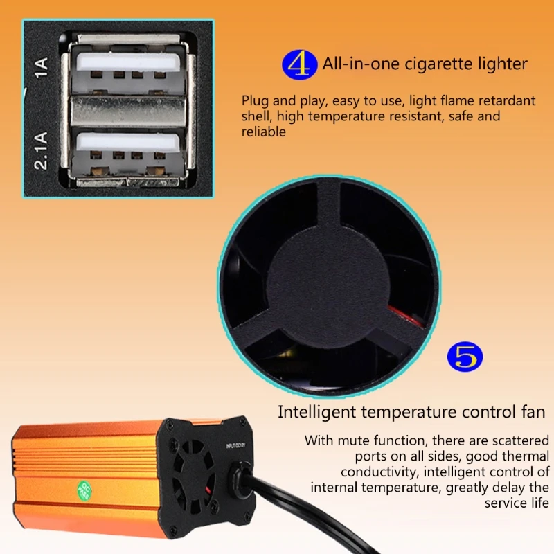 Стандартная универсальная розетка, выход Европейского/американского стандарта 110 В/220 В, со стандартным USB-интерфейсом 5 В, 1 А и а, встроенный прикуриватель plug and play, прост в использовании, устойчив к высоким температурам. Встроенная функция отключения звука, вентиляционные отверстия со всех сторон, хорошая теплопроводность, что значительно задерживает срок службы.