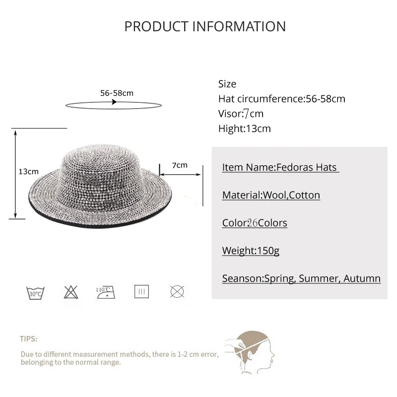 Размер: 56-58 см Поля: 7 см Высота крышки: 12 см Дизайн: стразы; Шляпа-федора; Подходит для сценических вечеринок Модная шляпа во всем процессе. Плоский карниз в стиле джаз, модный И простой европейский и американский стиль, есть множество Аксессуары на выбор, я надеюсь принести вам хороший опыт, спасибо Вы