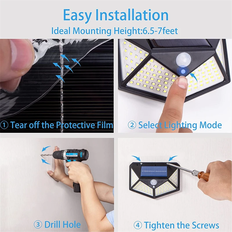 Солнечная панель находится в верхней части лампы. Он автоматически хранит электричество в течение дня. Пожалуйста, установите продукт в месте прямого солнечного света. Этот уличный солнечный светильник беспроводной. Вы можете установить его на стену